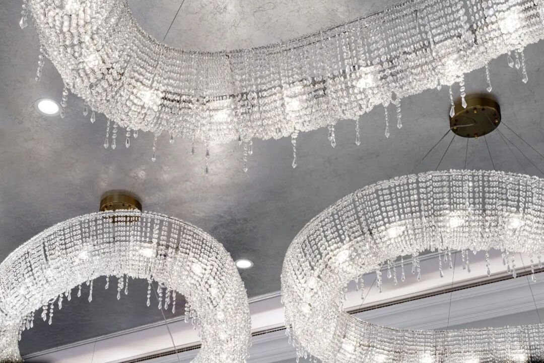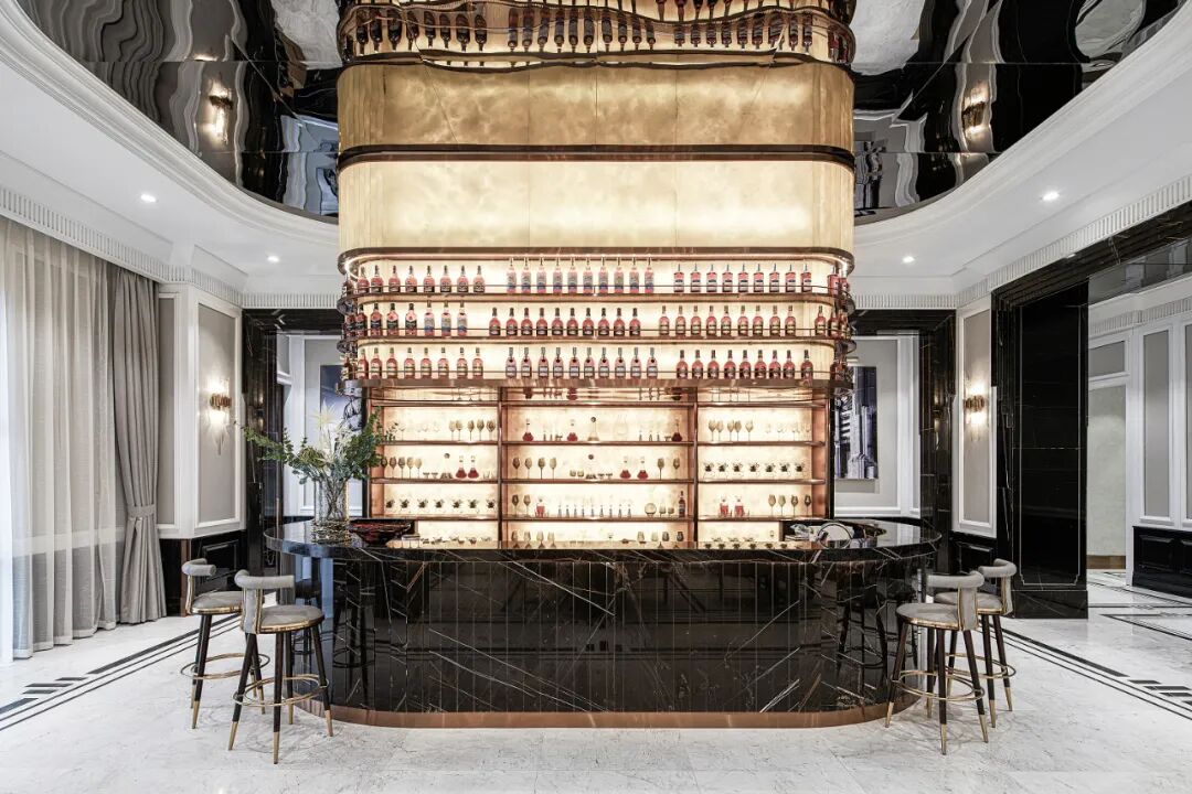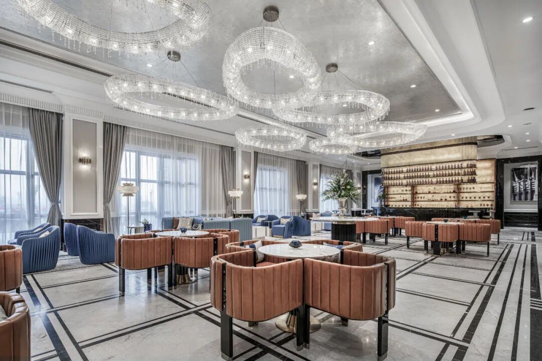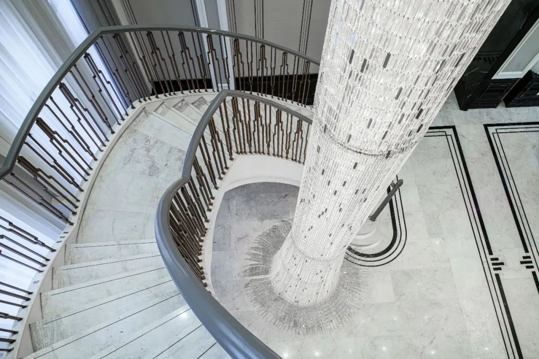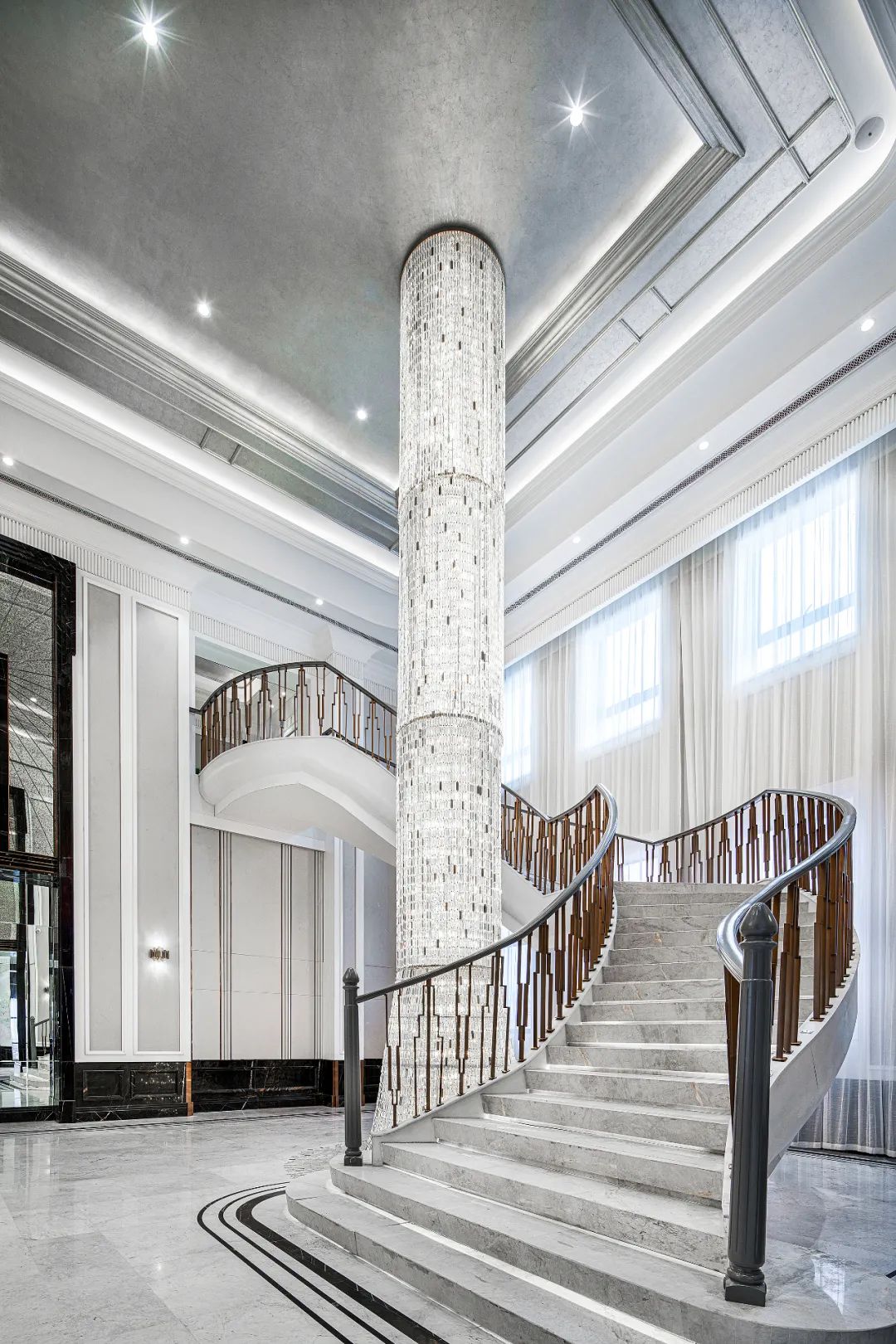 空间高耸开阔,由晶莹的水晶片繁饰的立柱直冲云霄,草叶纹装饰的旋转楼梯徐徐攀升,游走于古典和现代之间。