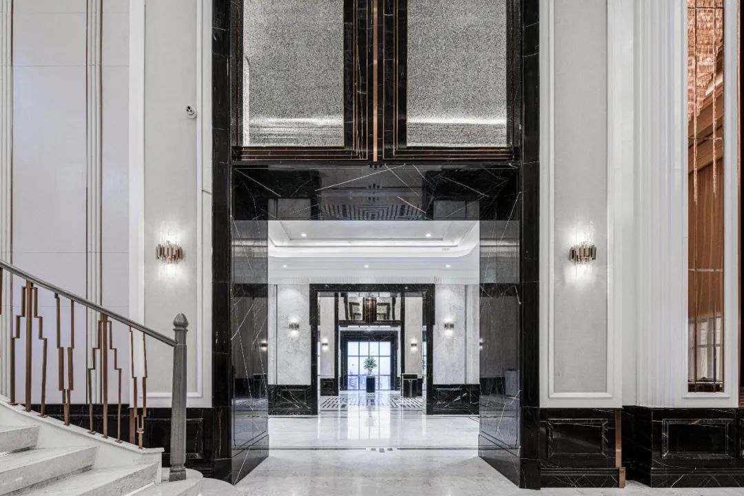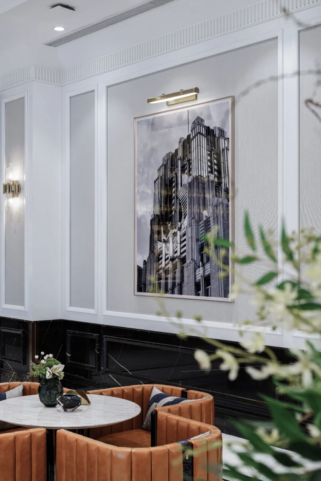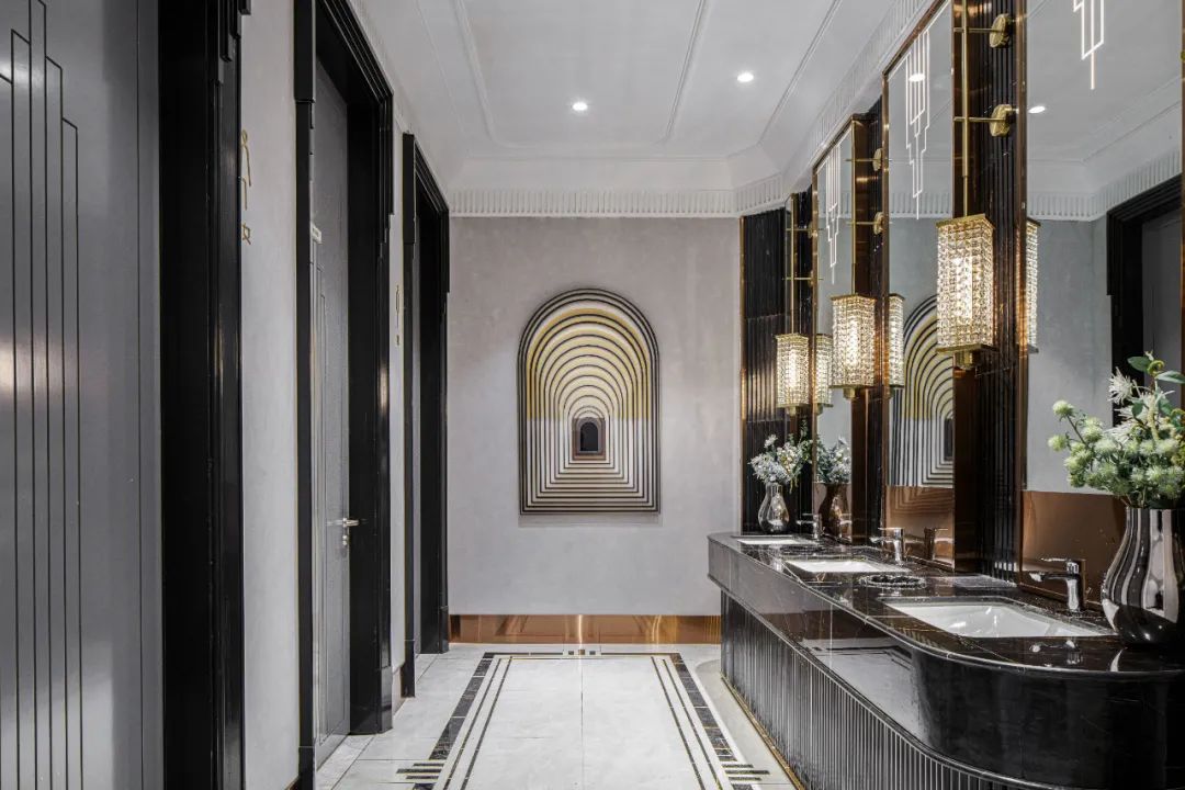 几何、机械样式和图像化的艺术样式,是Art Deco钟爱的母题,象牙白地面与水晶灯立柱交相辉映,黑色装饰线极致勾勒出精髓。烘托出一派典雅的气质。