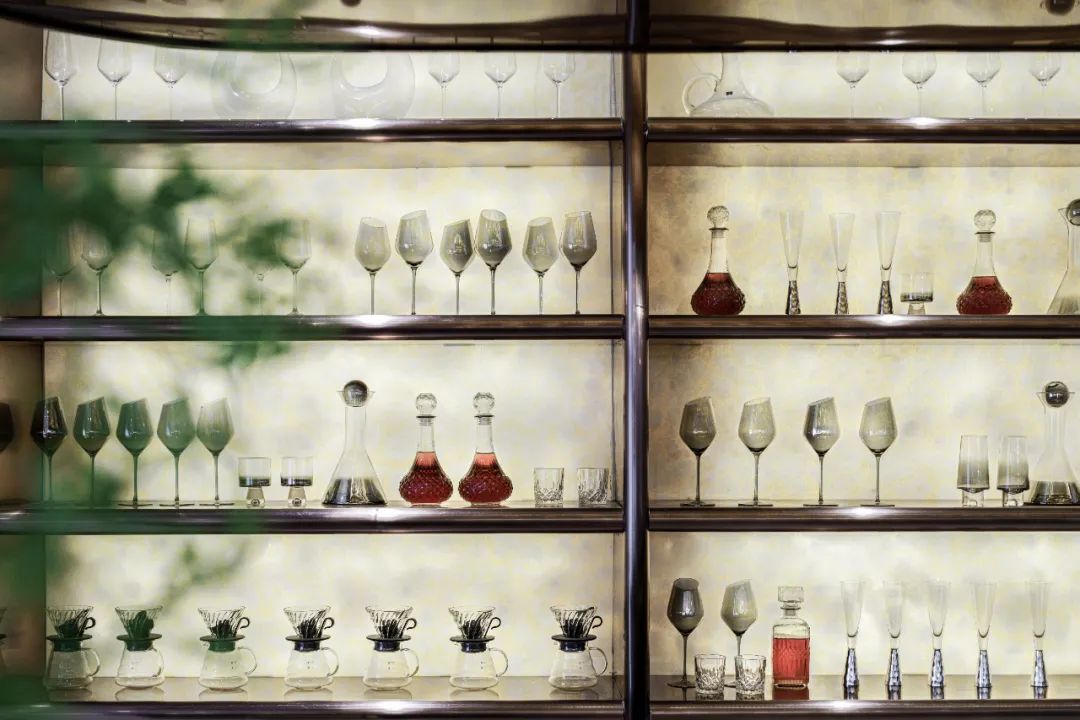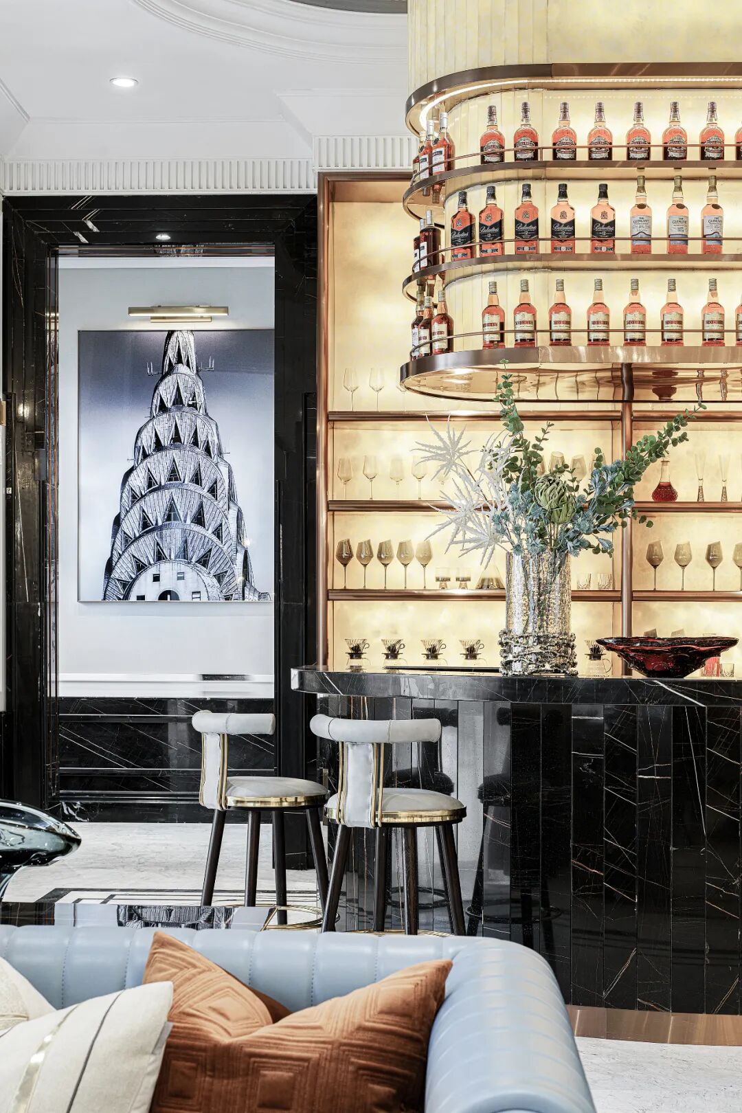 马提尼摇酒器、冰桶与装满烈酒的杯瓶,克莱斯勒大厦的黑白摄影,展现生动的结构之美。爵士时代的生命力被激活,任由你在喧嚣的20年代尽情摇摆。