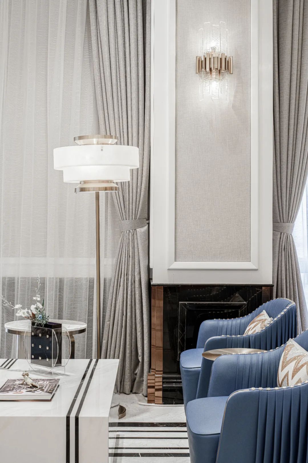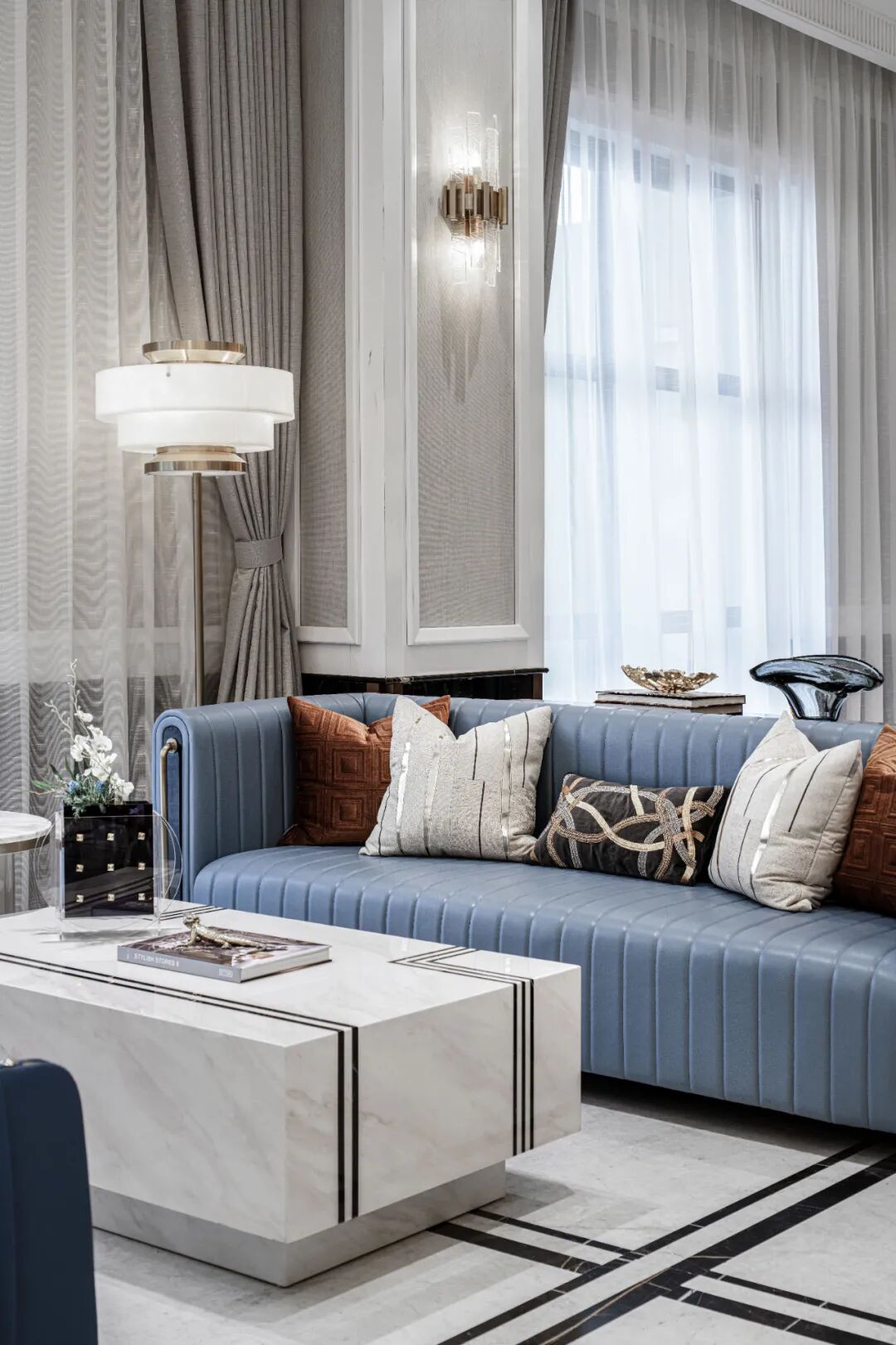 皮革与布艺进行多重的叠搭,咖橙色和尼加拉蓝的激情撞色,带有金属味道的金、银、古铜交相辉映,陈设品彰显了品味亦是彰显价值体系。