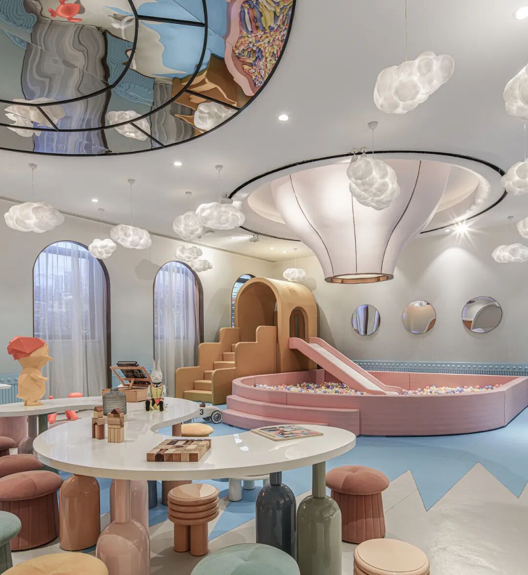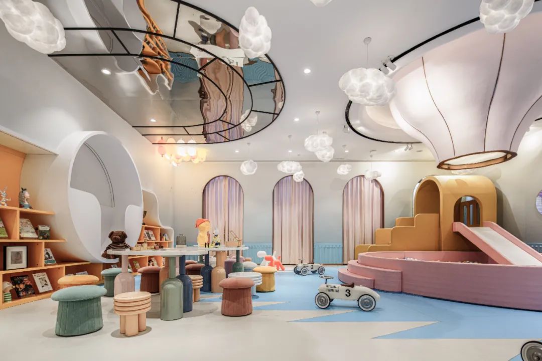放射状的装置和提炼自齿轮元素的镜面,象征了新时代的黎明曙光。云朵灯具绵软而柔美,为场域增添几分亲和力。