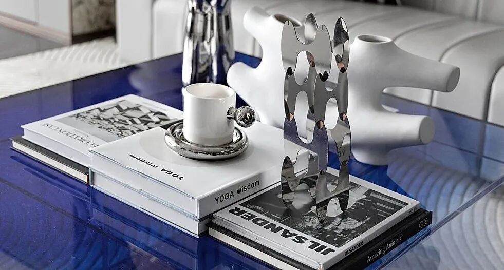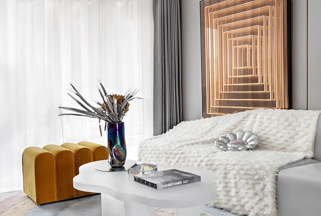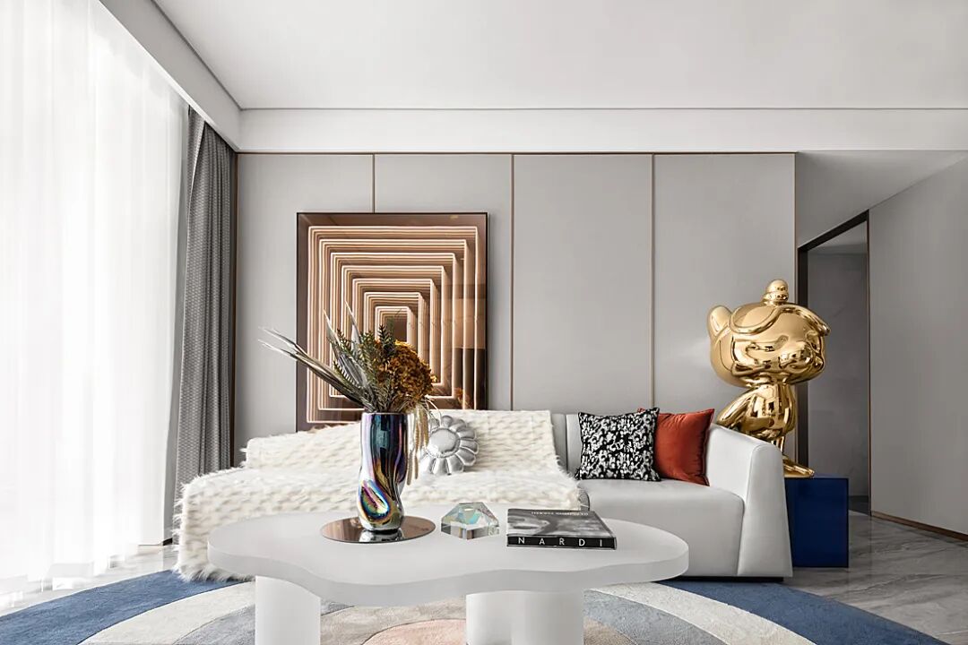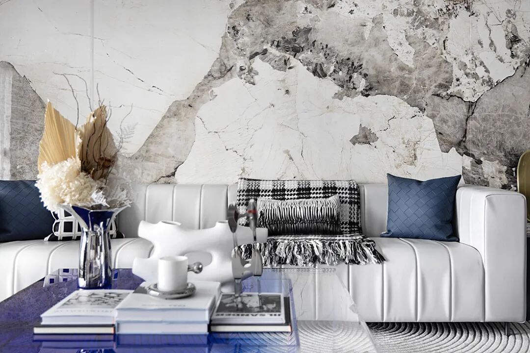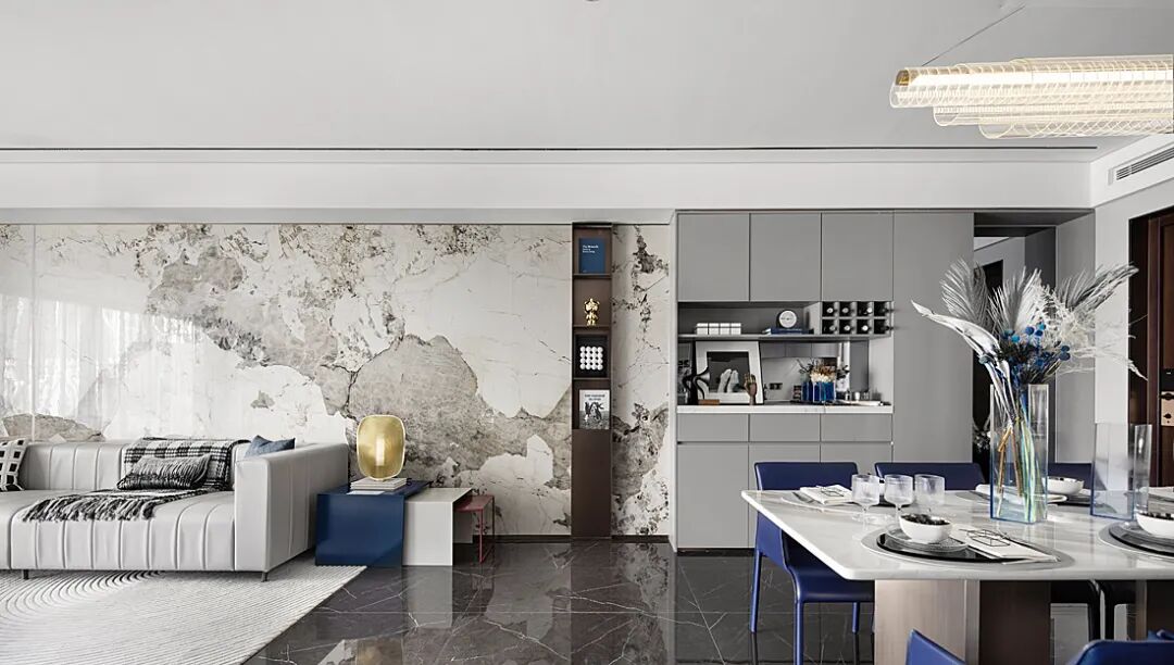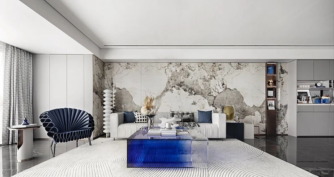 克莱因蓝玻璃茶几线条凌厉、极具艺术感,无疑成为客厅的点睛之笔。大理石的天然纹理如水墨画般,气势恢宏地在墙面上肆意泼洒,成为客厅独特的风景。