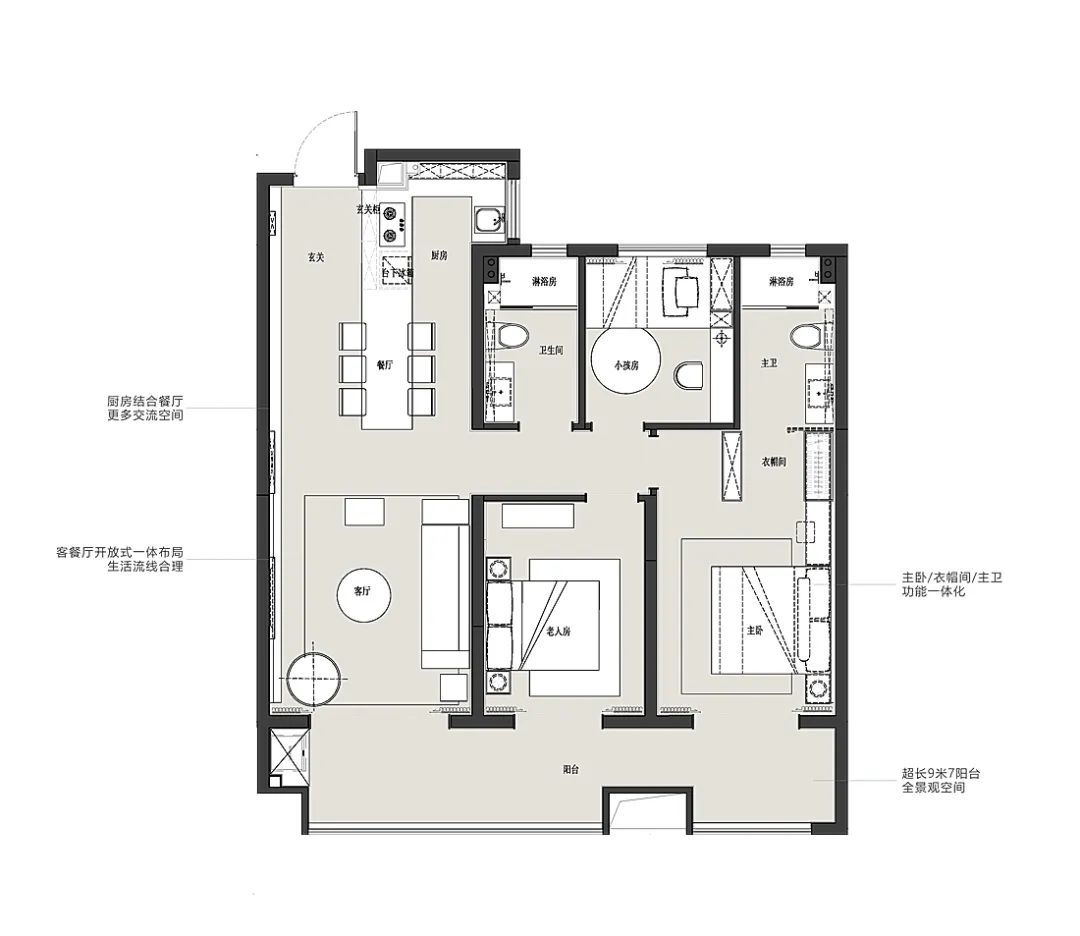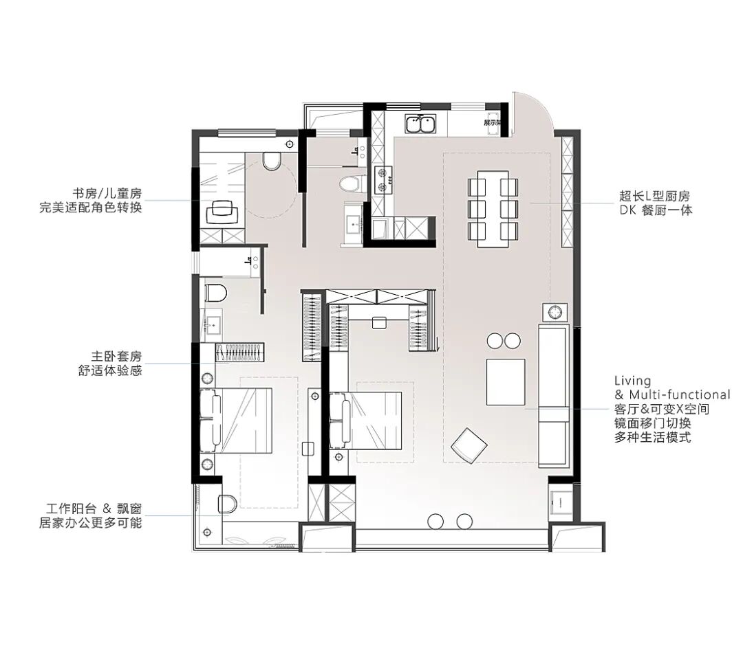 S.U.N DESIGN 作品 六安旭辉中心 124 m²户型 打破起居室的固有思维,以镜面移门取缔电视背景墙,将多功能空间、阳台与客厅进行有机结合,探索居家空间的无限可能。通过空间布局重组,不同家庭成员都能在起居室自得其乐,彼此共生又相互独立。