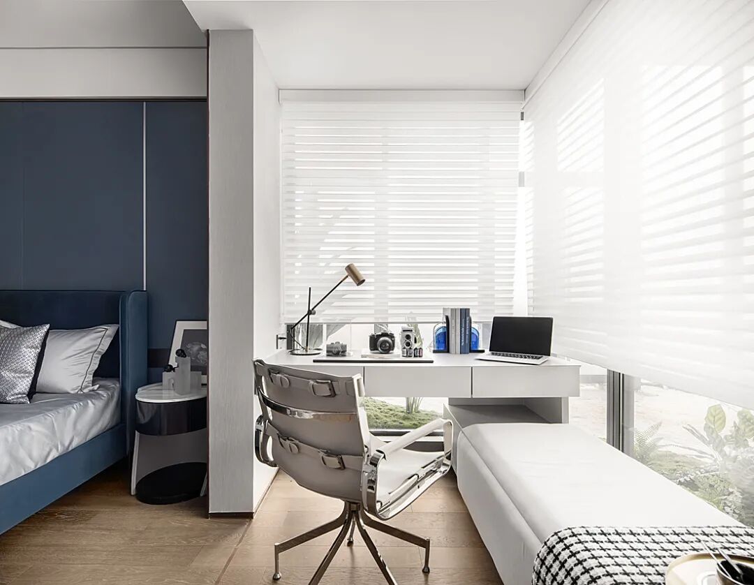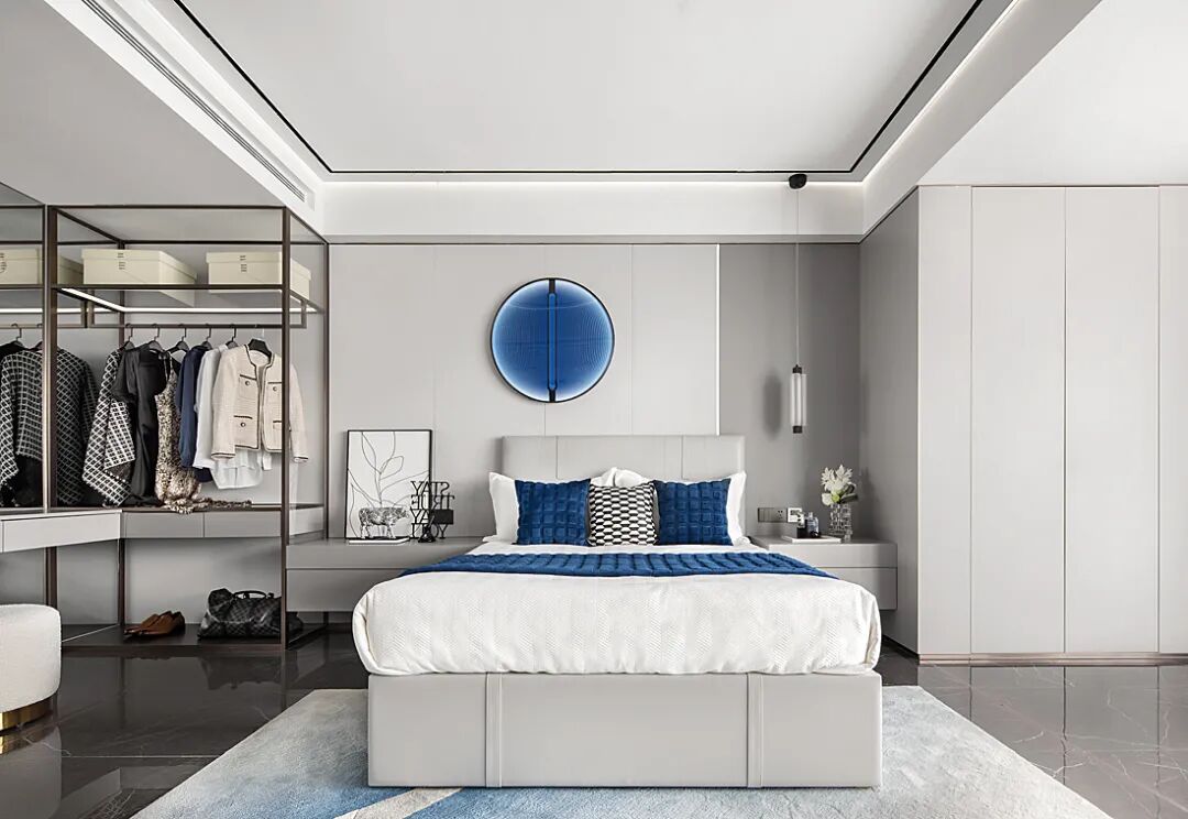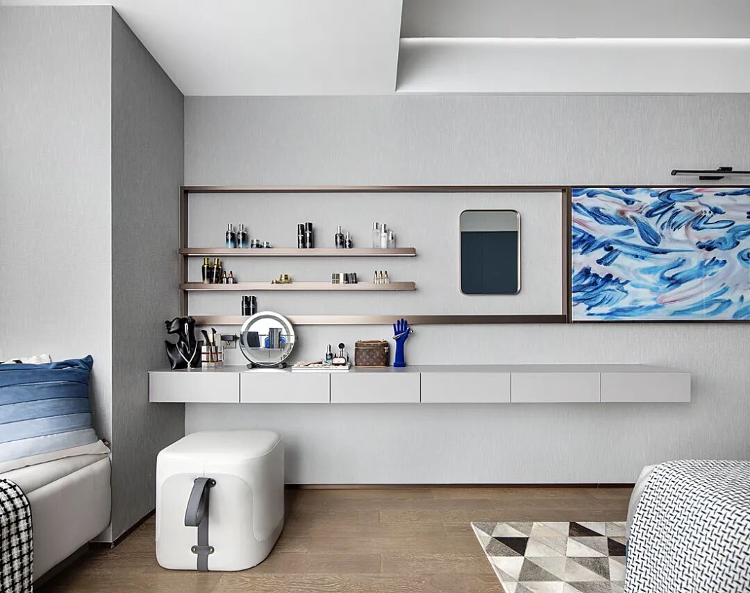 步入式衣帽间分区合理、实现收纳空间最大化。设计师将橱窗设计理念引入衣橱,通过衣物的陈列,寻找收纳的艺术化表达。流苏蓝色椅墩平衡几何的刚性,带来几分飘逸与温柔。