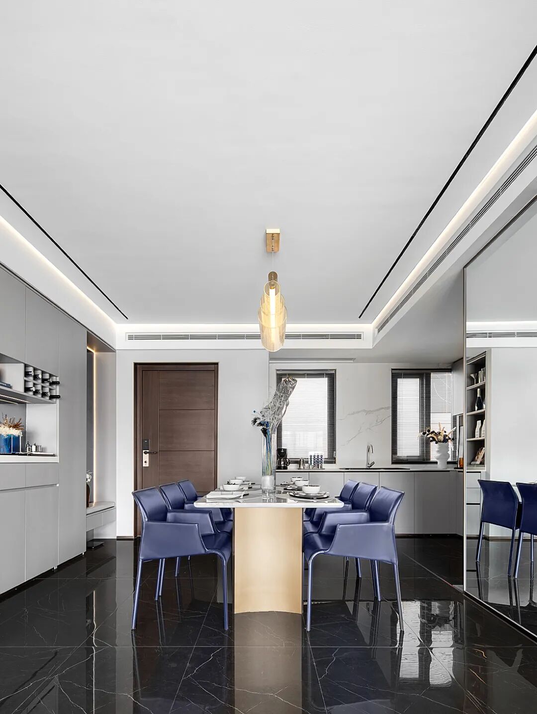 开放式厨房采用L型布局,以黑白灰作为主色调,打造时髦的现代餐厨空间。大理石与金属在经典蓝的映衬下更加凸显质感,顶部灯光与底部黄铜遥相呼应,为空间注入几分暖意。