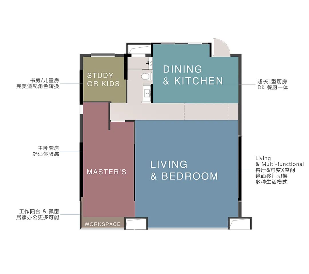 多功能空间可作为一个灵动多变的空间,采用移门镜面设计,隔而不断,开门时感受实体空间交流互通,关门时体会镜面空间双倍放大,在日常生活增加别样空间体验。