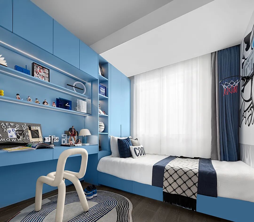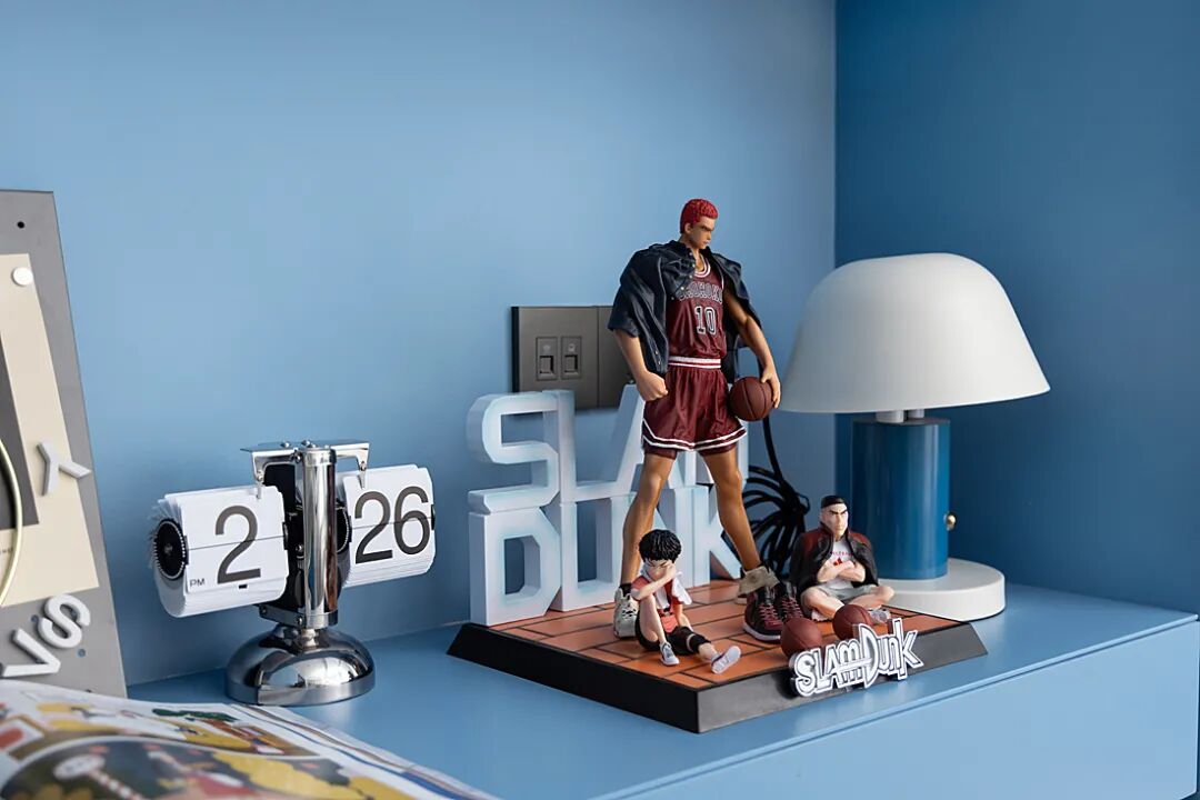 设计师将这一美好希冀运用到空间设计中家具如乐高积木般一体式堆叠,最大化利用空间又不失个性化的表达。巨幅篮球少年涂鸦、樱木手办与签名版足球,少年的清新与朝气扑面而来。