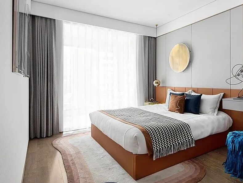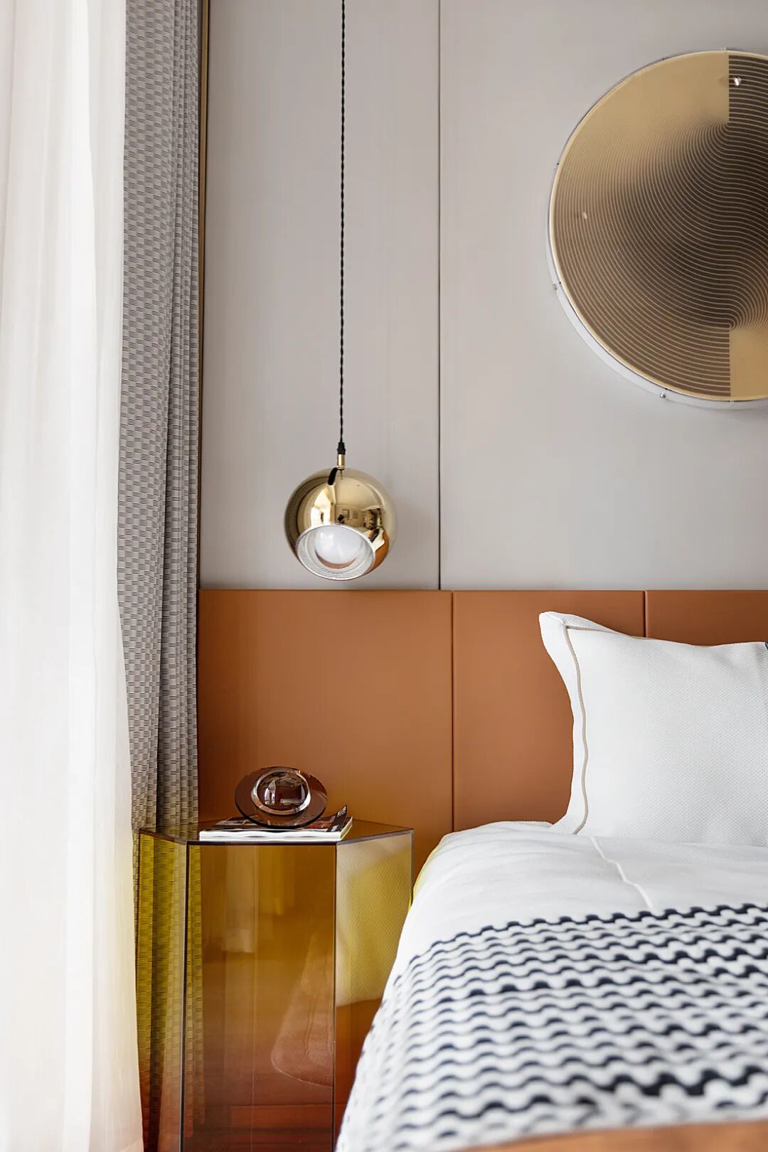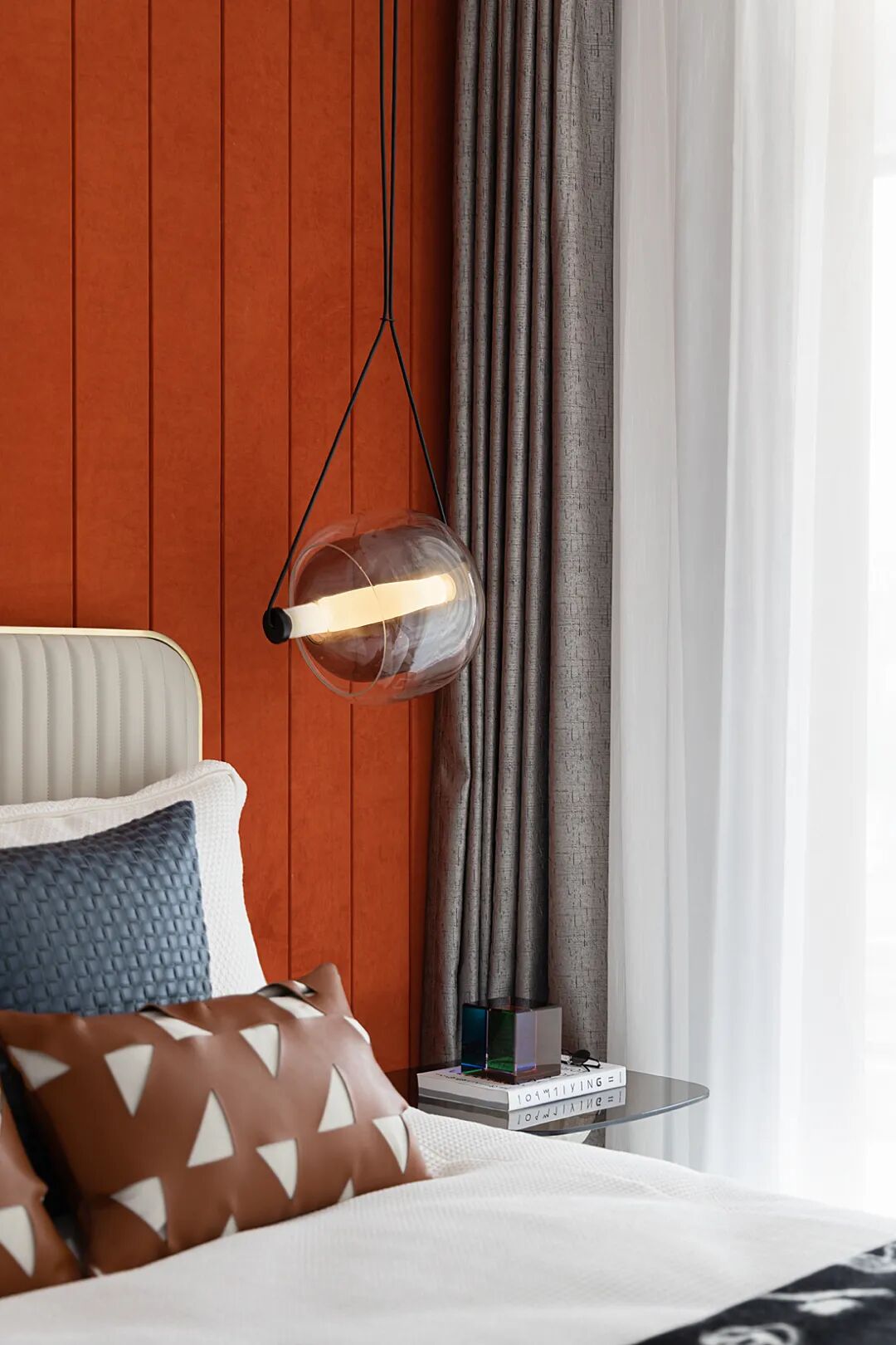主卧延续暖橙的活力与雅致,通过色彩与材质的有机组合,营造空间的层次与韵律。设计师以墙裙为灵感,延伸床背板,与床品、地毯进行色块呼应。