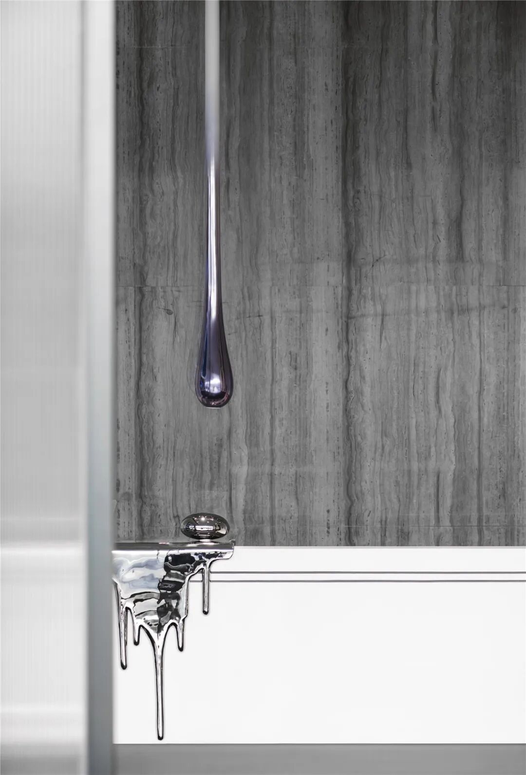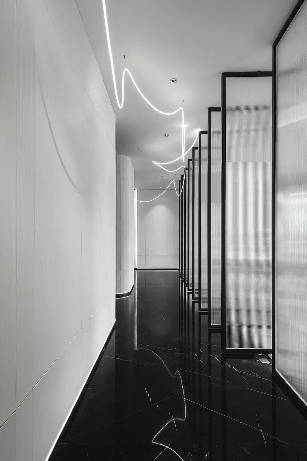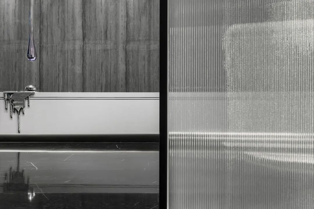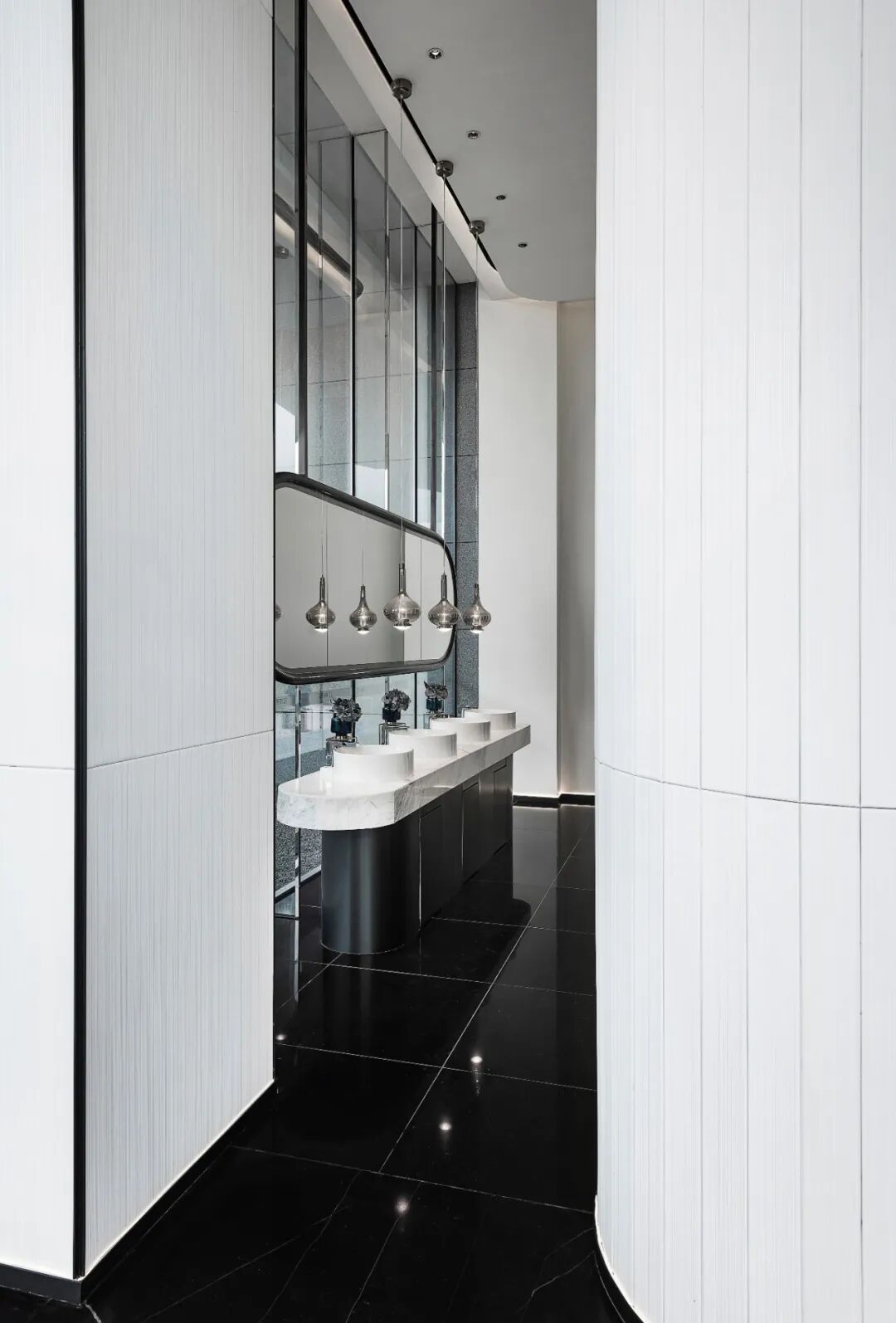 步入二层,中性的灰色调铺满整个空间。黑色石材和白色纹理在微妙的反射之下将环境的轮廓描摹得影影绰绰。