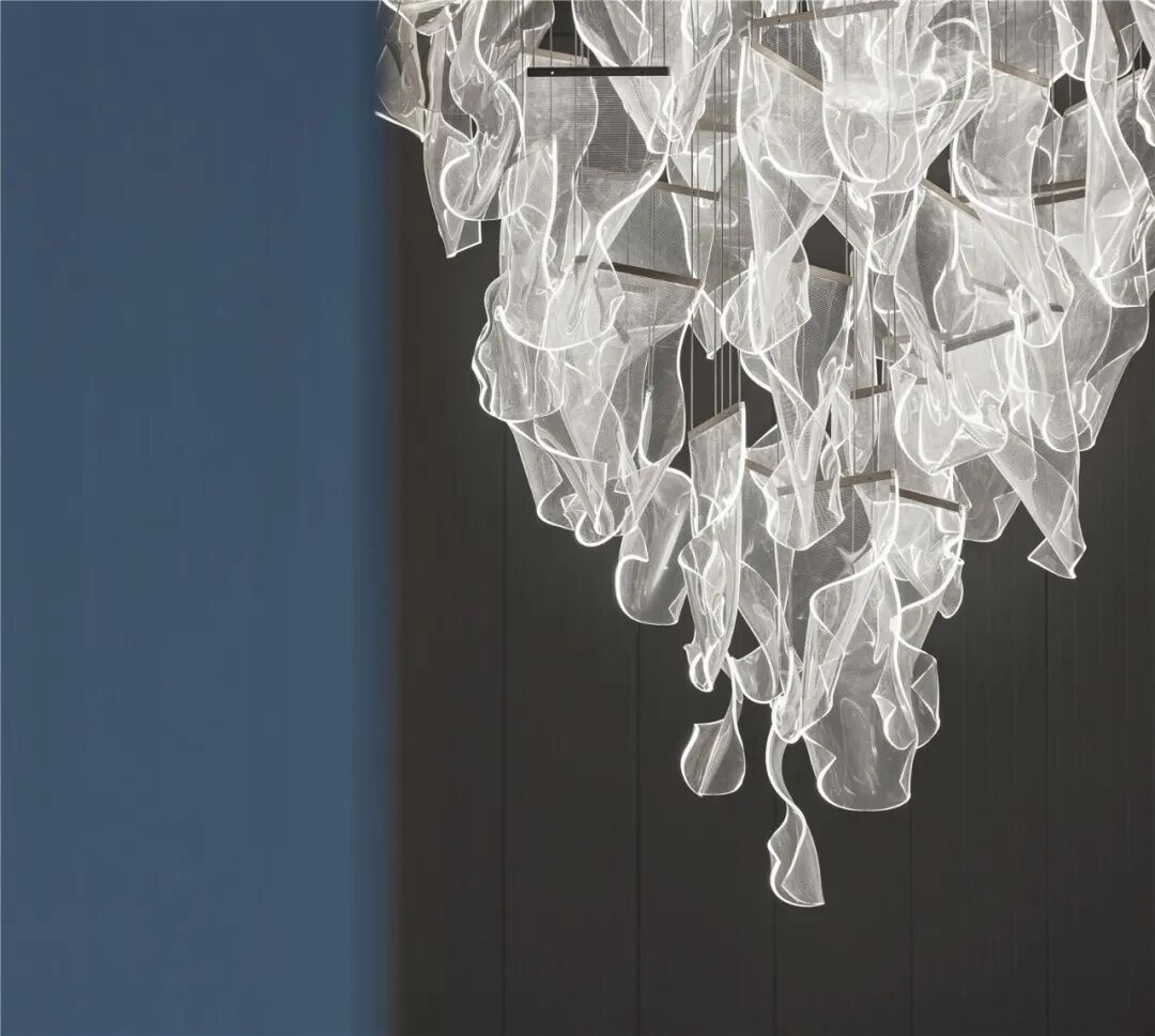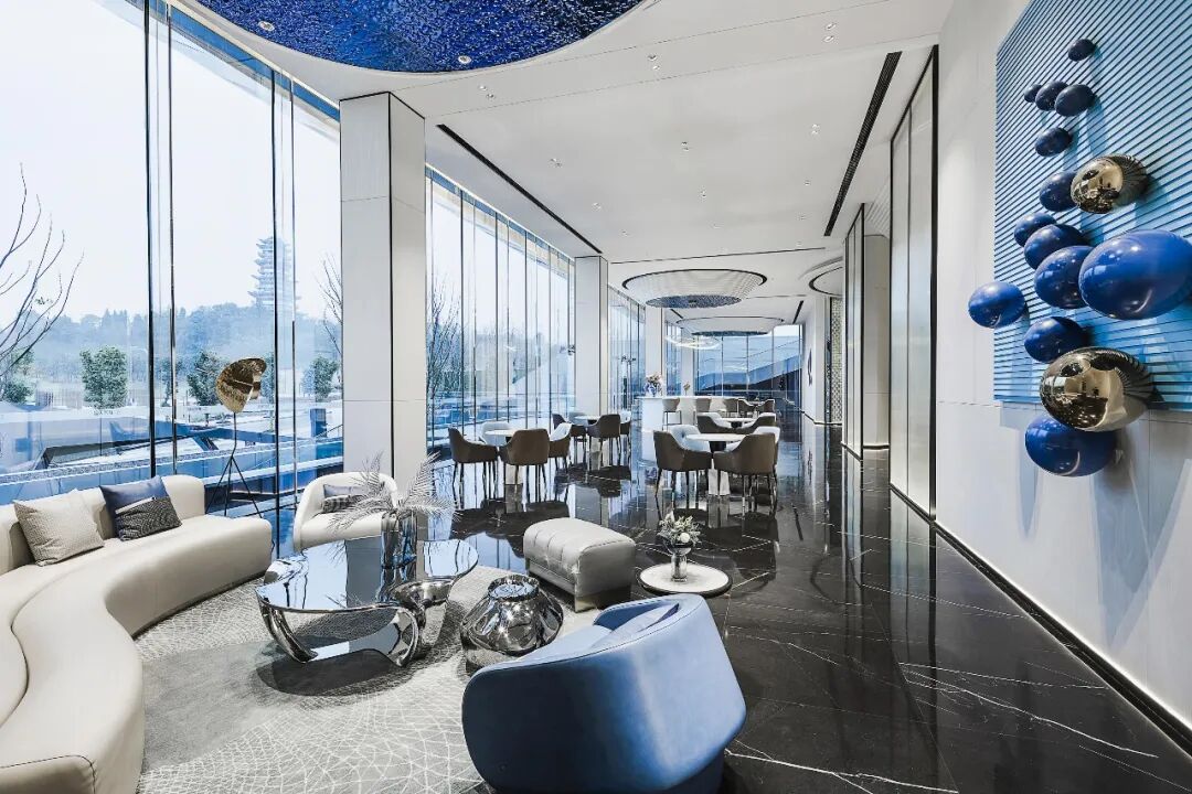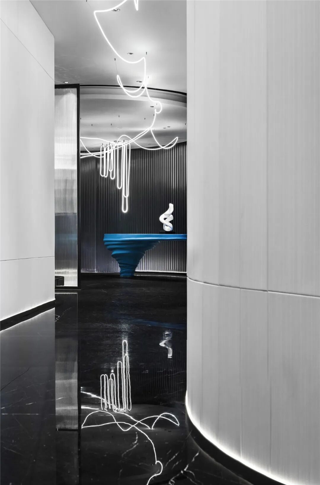 The blue surface distributed above the model and the water bar making the continuous “water” ripples unfold in the space with contemporary design techniques.