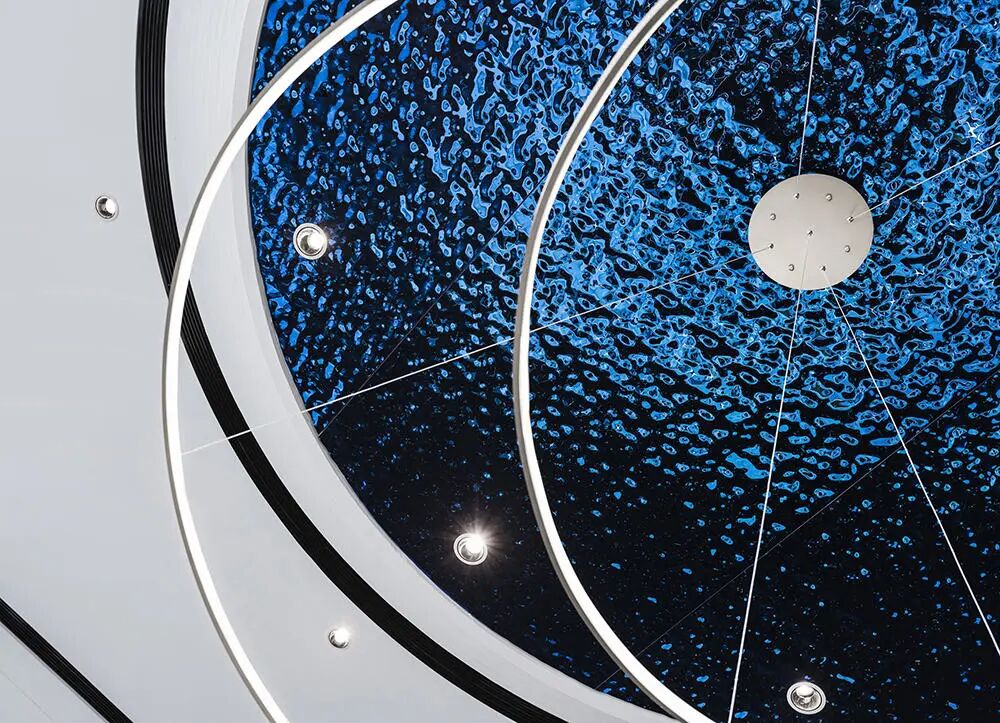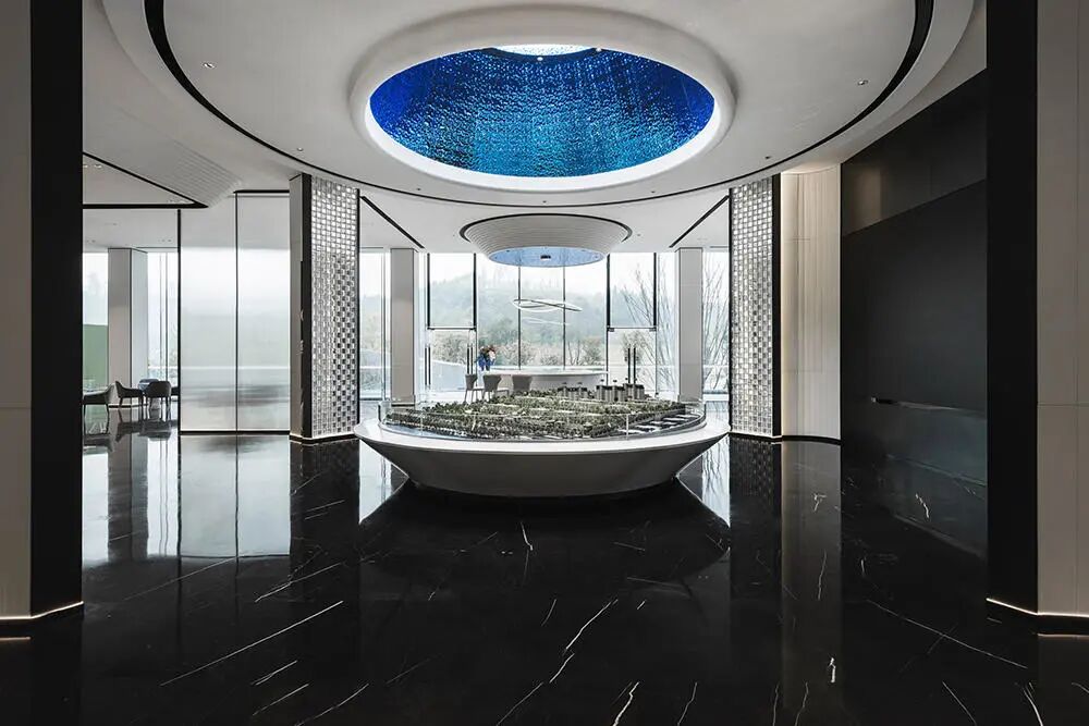 蓝如碧波的圆形顶面以拱起之势分布在沙盘和水吧之上。延绵流淌的“水”波纹以当代的设计手法在空间中展开。