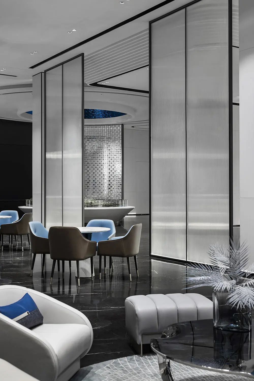 沙盘区由玻璃砖墙面围和,在简约的空间中,晶莹剔透的质感焕发低调而轻奢的通透感。