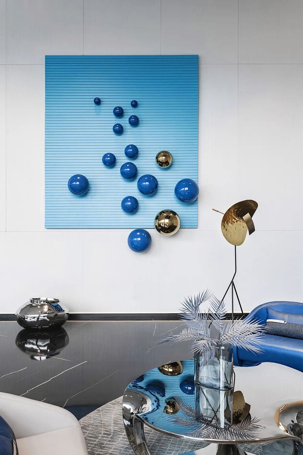 Chosing blue with different dimensions as the protagonist of the space narrative playfully shows the contemporary fashion.