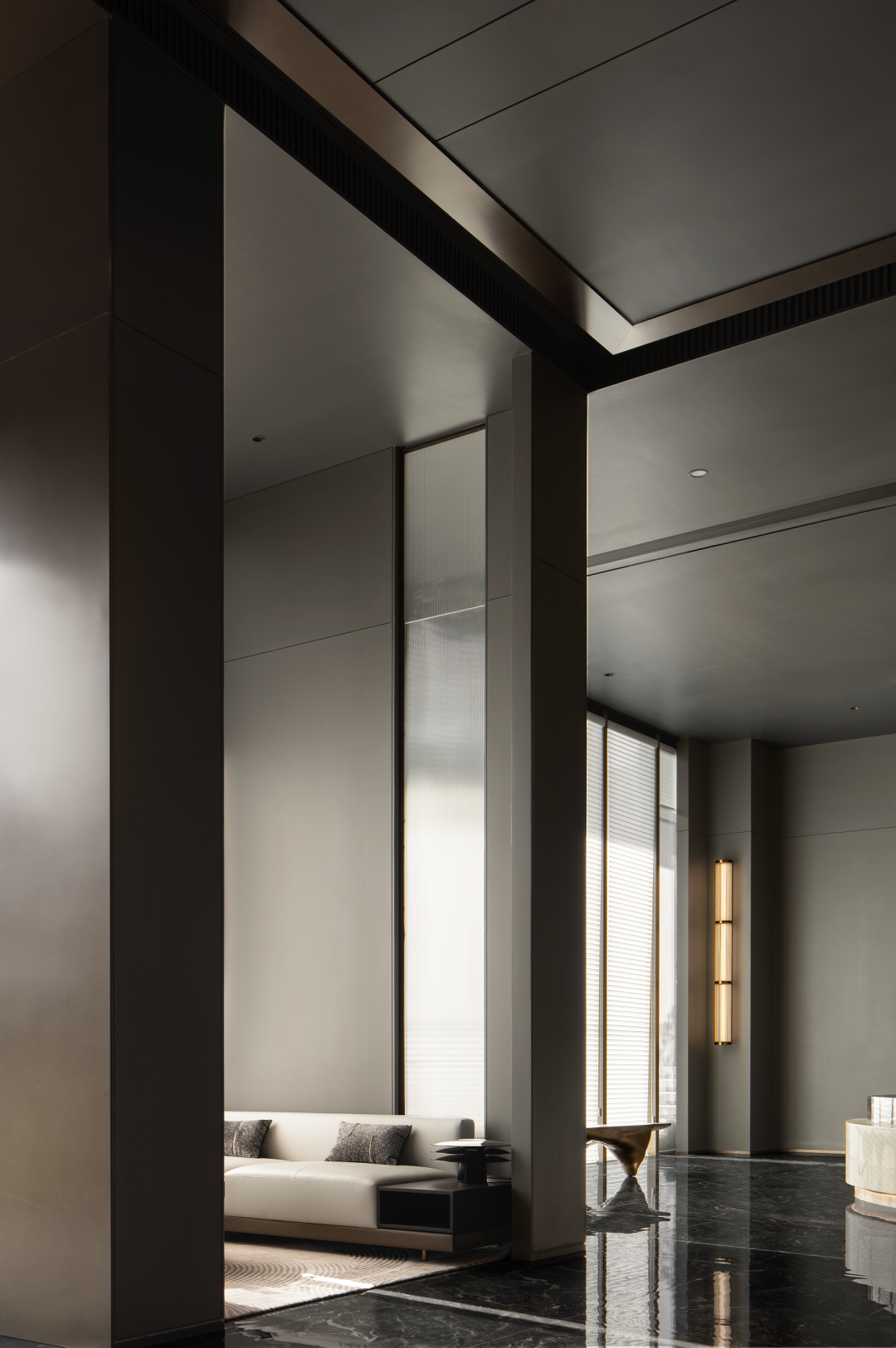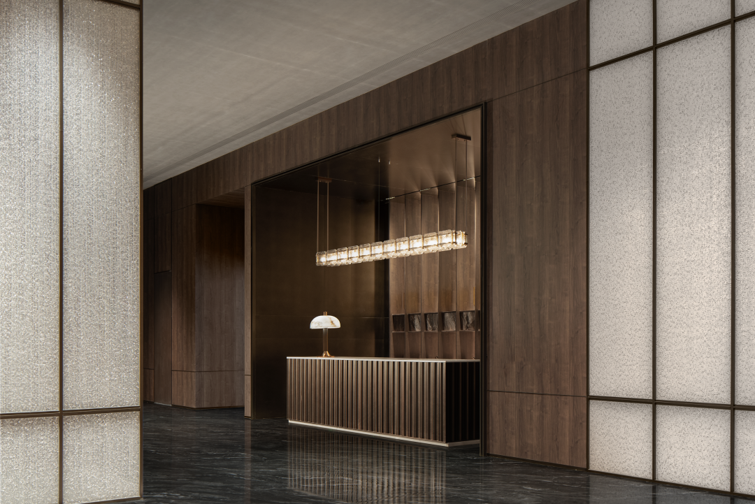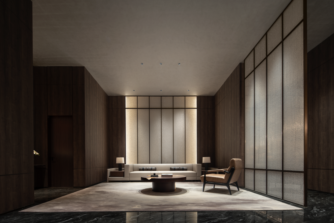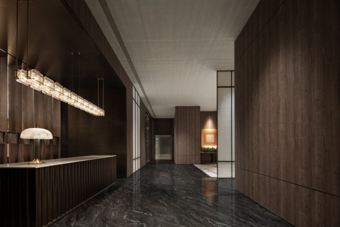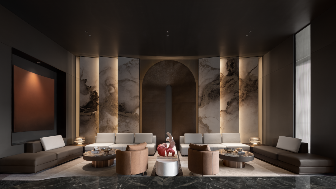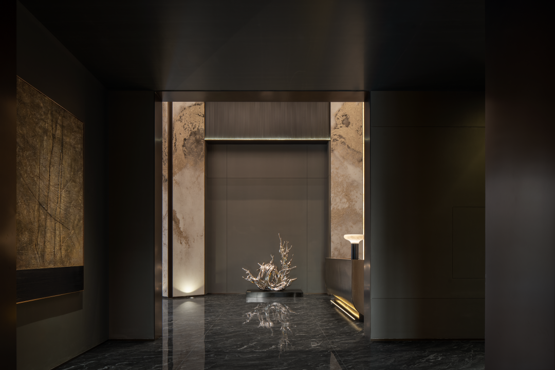 以建筑的手法去诠释入场空间的风格,利用大尺度开间的挑高门厅奠定开敞的门厅空间场域,同时辅以作画般的技巧,平衡色彩、尺度、材质布局等要素。