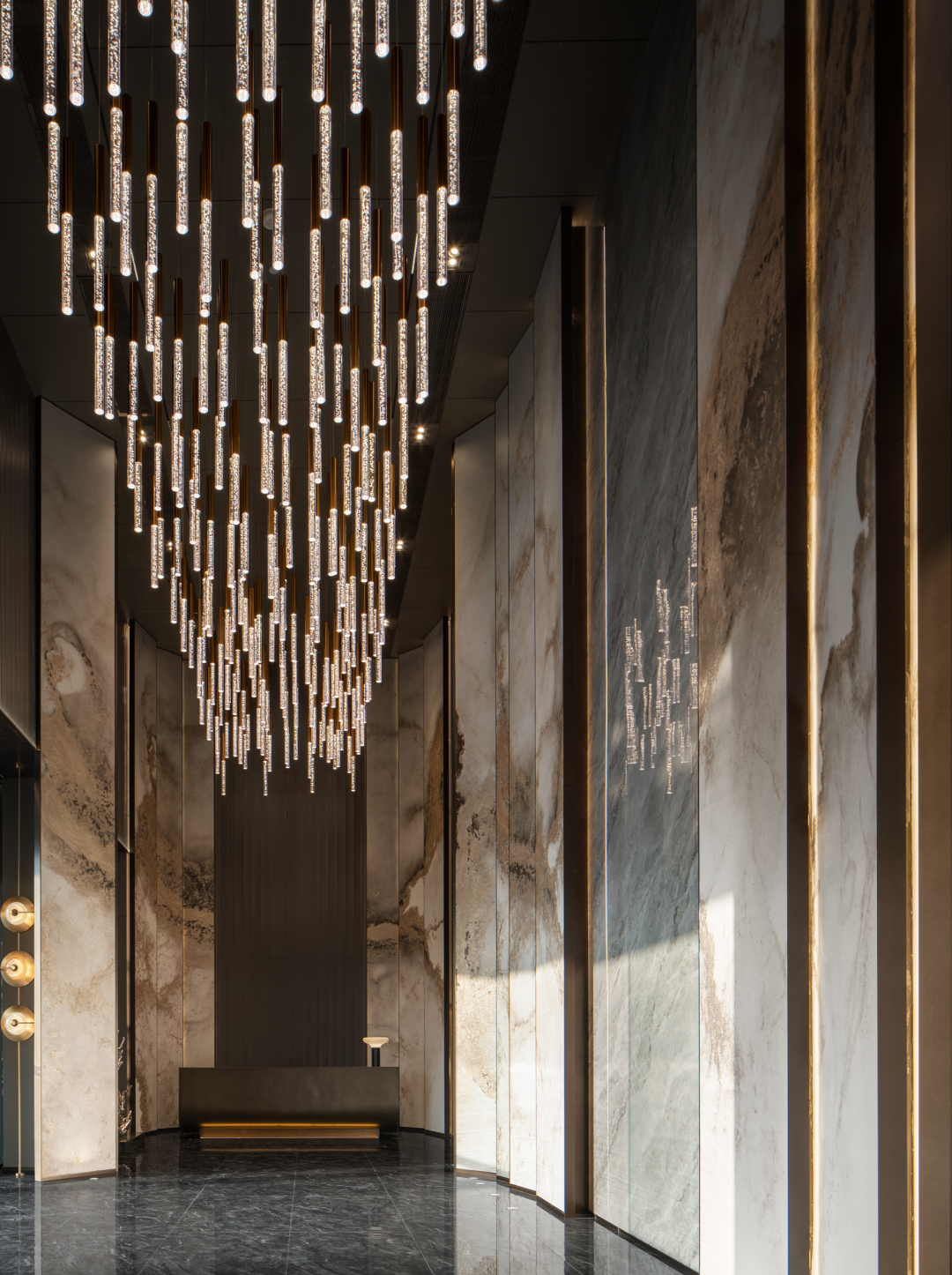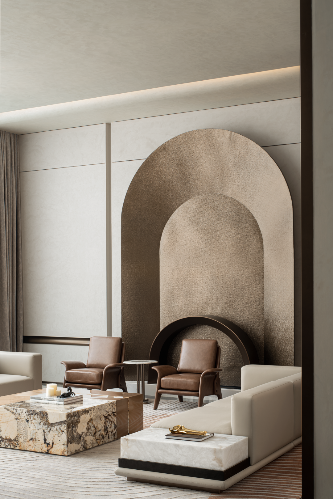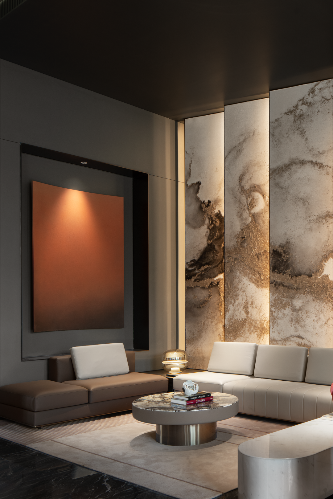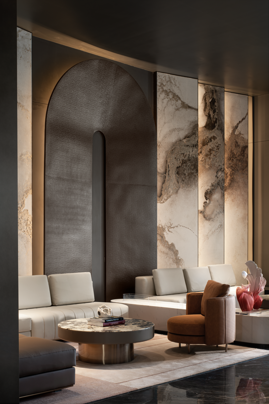以建筑的手法去诠释入场空间的风格,利用大尺度开间的挑高门厅奠定开敞的门厅空间场域,同时辅以作画般的技巧,平衡色彩、尺度、材质布局等要素。