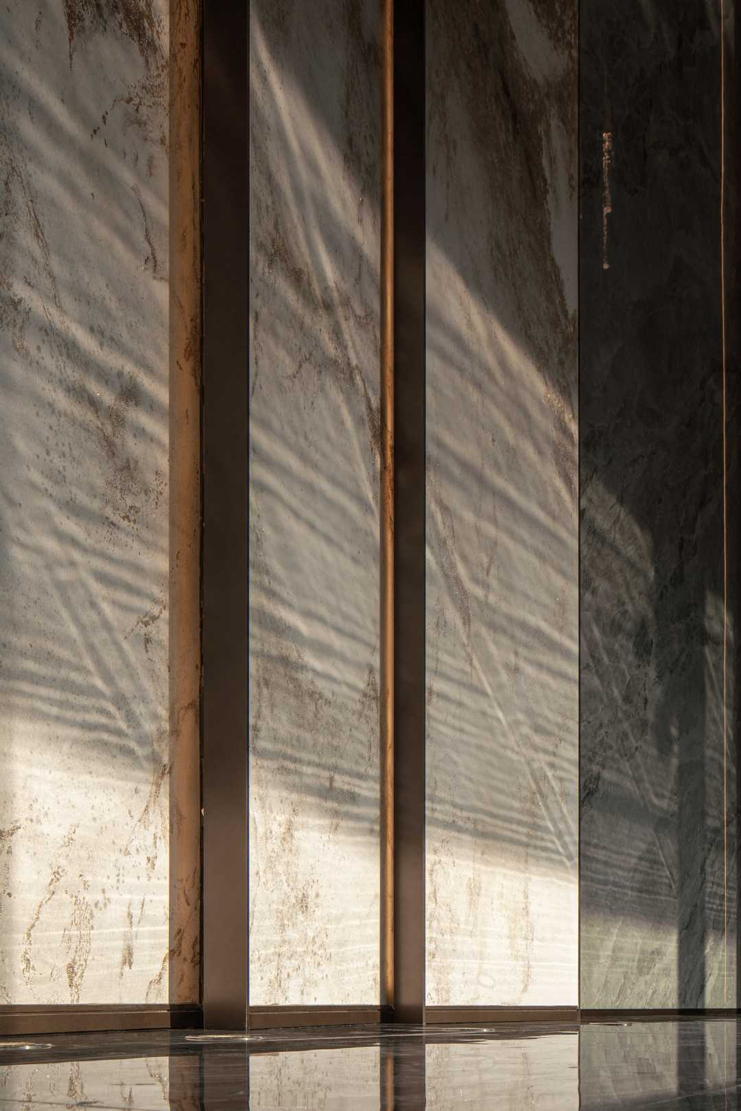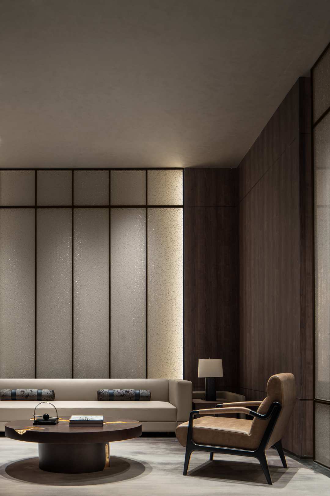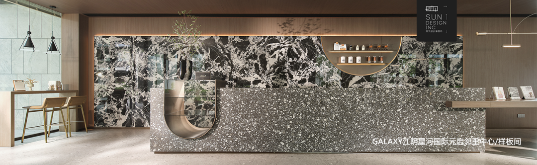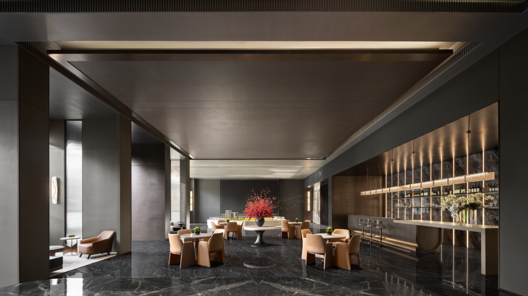 深度洽谈区对望之处便是浅度洽谈区,从远处望向岩板地面,宛如水波荡漾,将空间的风格从传统拉至现代,不变的是文墨留香的场景定义。