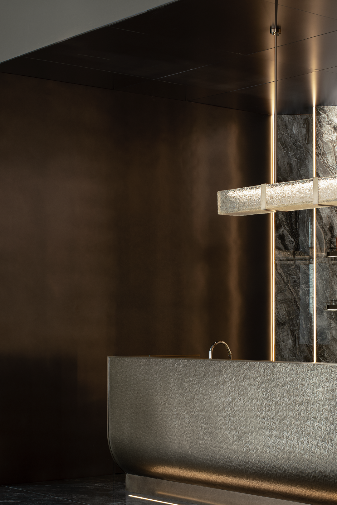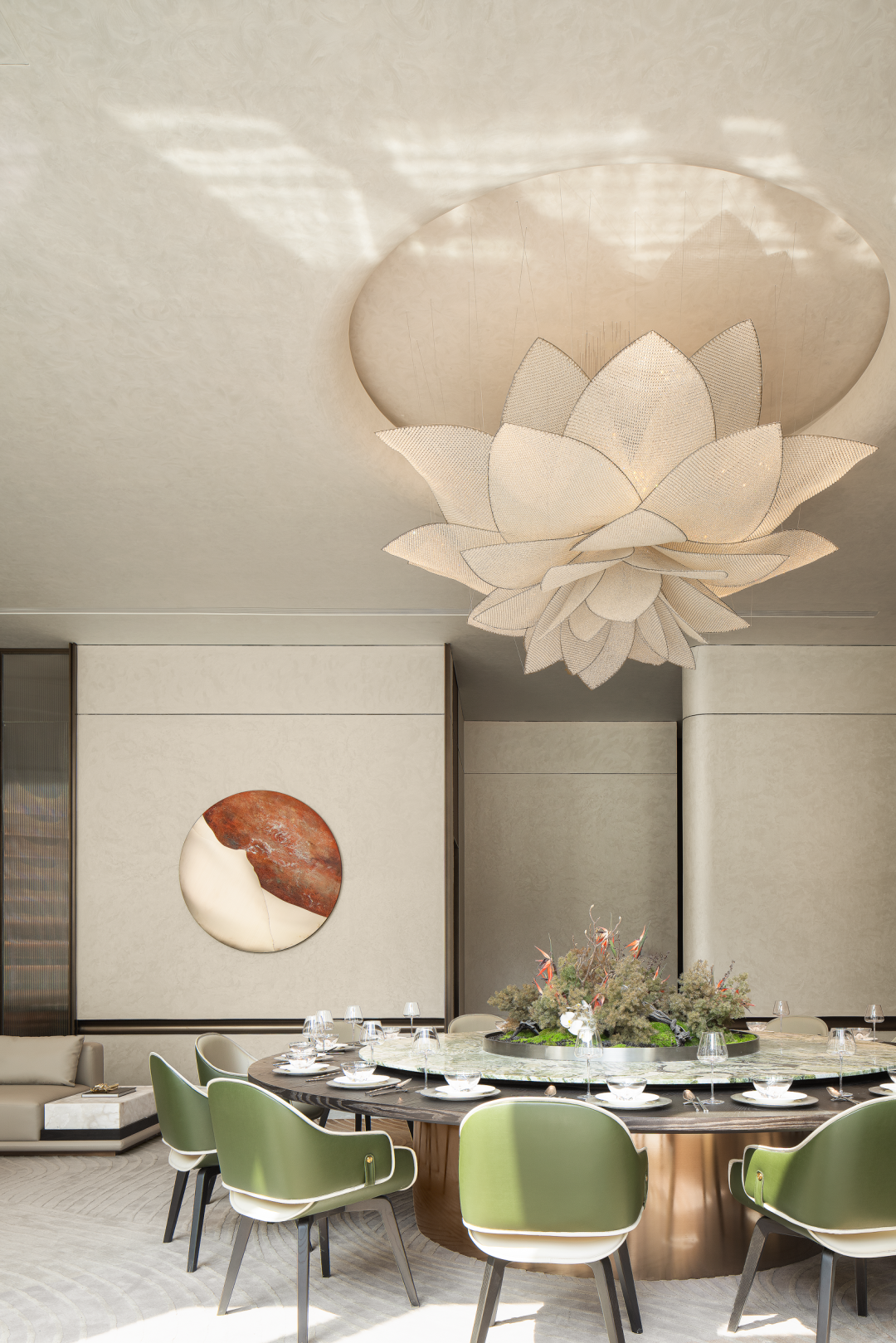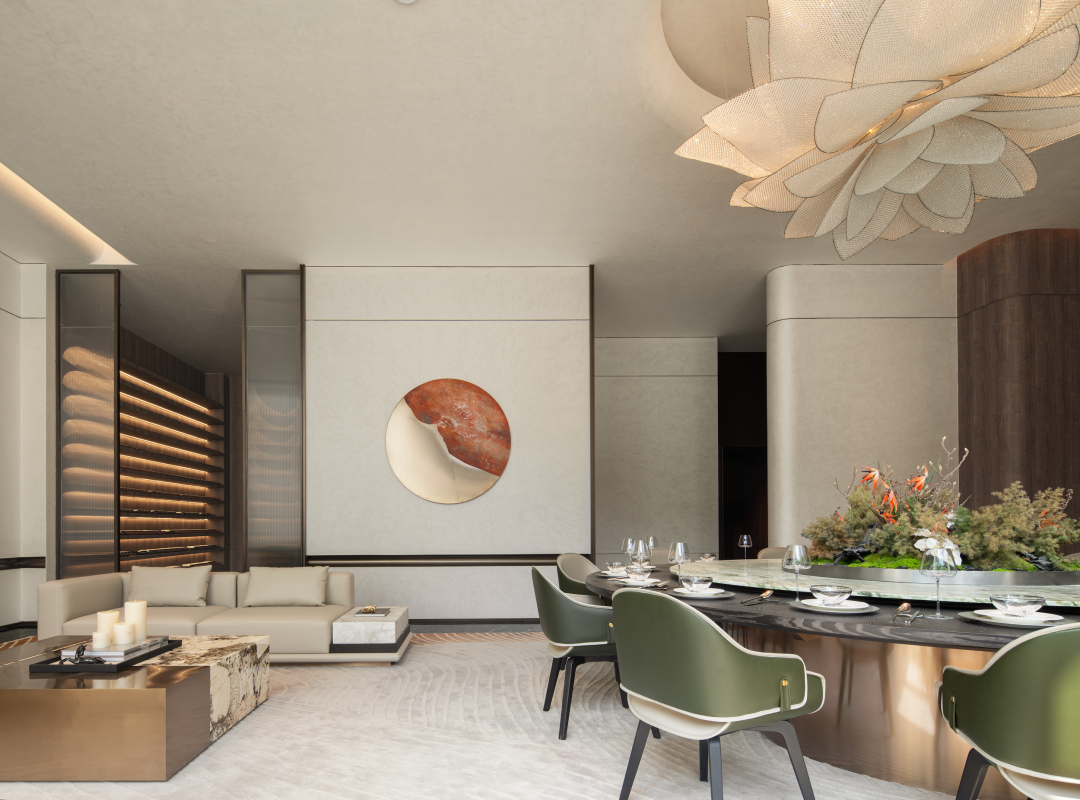 服务台作为会所的第一视觉落点,选用沉稳的深色作为基调,木饰面与金属板里外呼应,水纹砖与线性灯光的层层递进之中,雅致的会所逐渐凸显。休息区选用木饰面搭配磨砂玻璃,通过一疏一密的视觉转换来增添空间的层次感。色彩上遵循一致性,深褐色调从木饰面到胡桃木茶几,浅白色系从背景板到皮质沙发。在会所中加入私宴空间,完成更多功能性上的探索与可能。依据功能上的使用,私宴被划分为三小块区域,就餐区、休息区和品酒雪茄区。白色为空间构筑起留白,浅绿色皮质座椅和绿纹理餐桌岩板在就餐区凸显生机,与此同时大莲花灯在觥筹交错之间熠熠生辉。休息区与就餐区共处一个场景下,两者有着亲近贴合的依存感,可保证功能切换使用时的连贯性。软包沙发和弧形元素转达一种呵护与安抚,这里便是身体和精神的休憩之所。