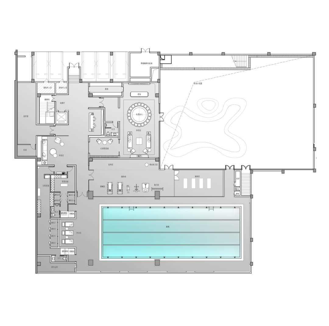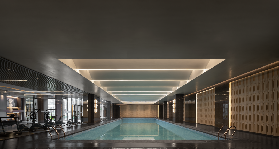 泳池墙体绘有拼花蓝色瓷砖,从远处望去一池碧水,静心舒气,引向更深层次的内心体验中。恒温功能的设定,最大程度的提升泳池空间的使用率。