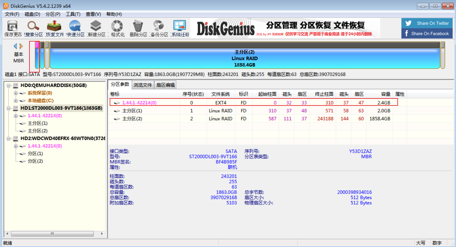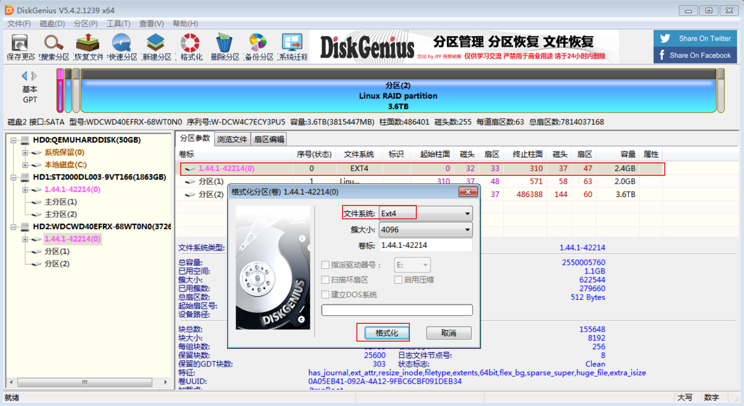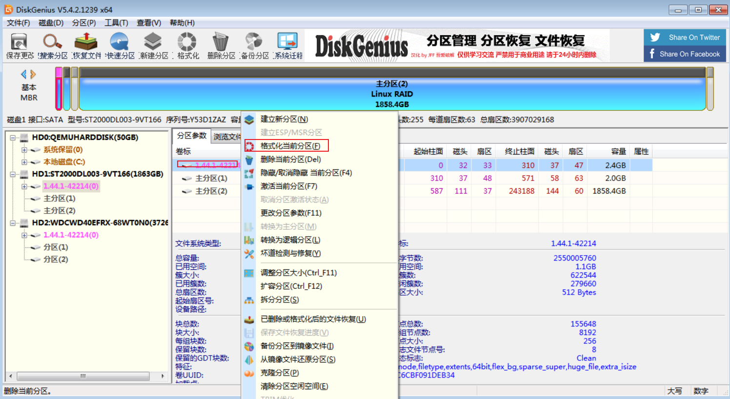 群晖的硬盘有三个分区,第1个分区是2.4G,群晖的系统就安装在这里。打开DiskGenius这个软件,选中第一个分区,直接格式化即可,注意,是格式化,不是删除。两个硬盘都是这样。