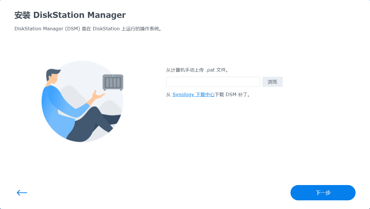 把处理好的硬盘,重新插回群晖里面,开机。 这时,熟悉的安装界面就出来了,重新上传pat系统文件就行了。