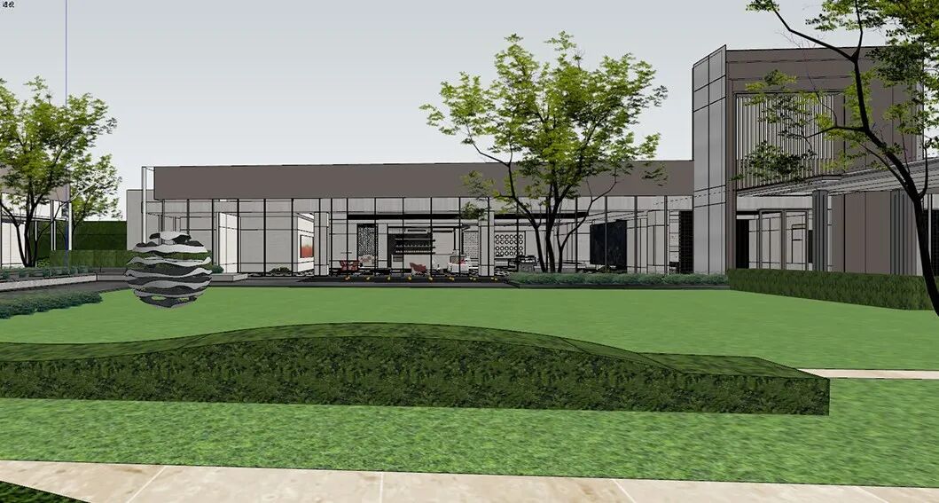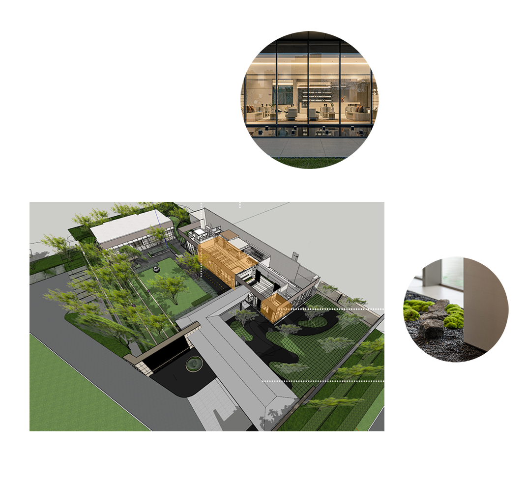 室内设计结合景观,把自然元素重新诠释以不同的形式引入室内,在品牌展示区与洽谈区打破室内外界限,以对景的手法再次将访客置身于自然之中。