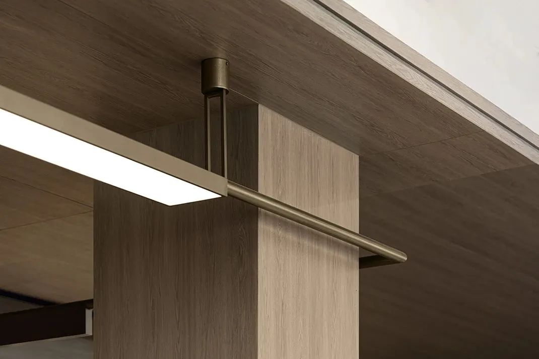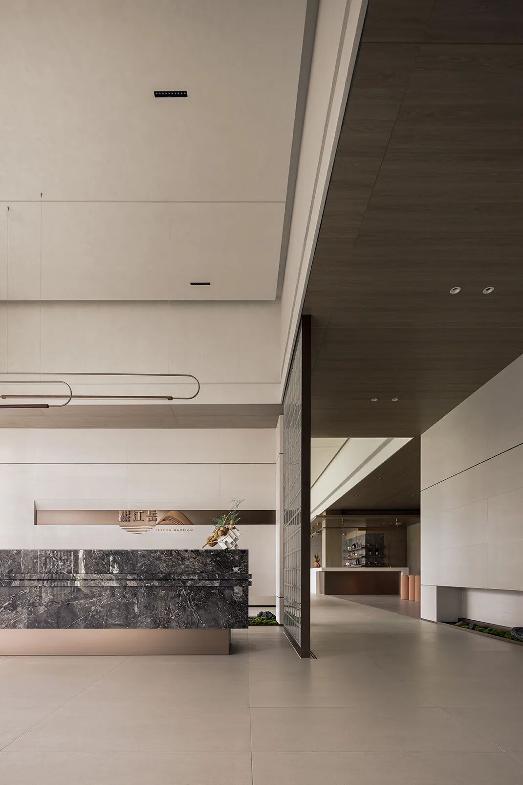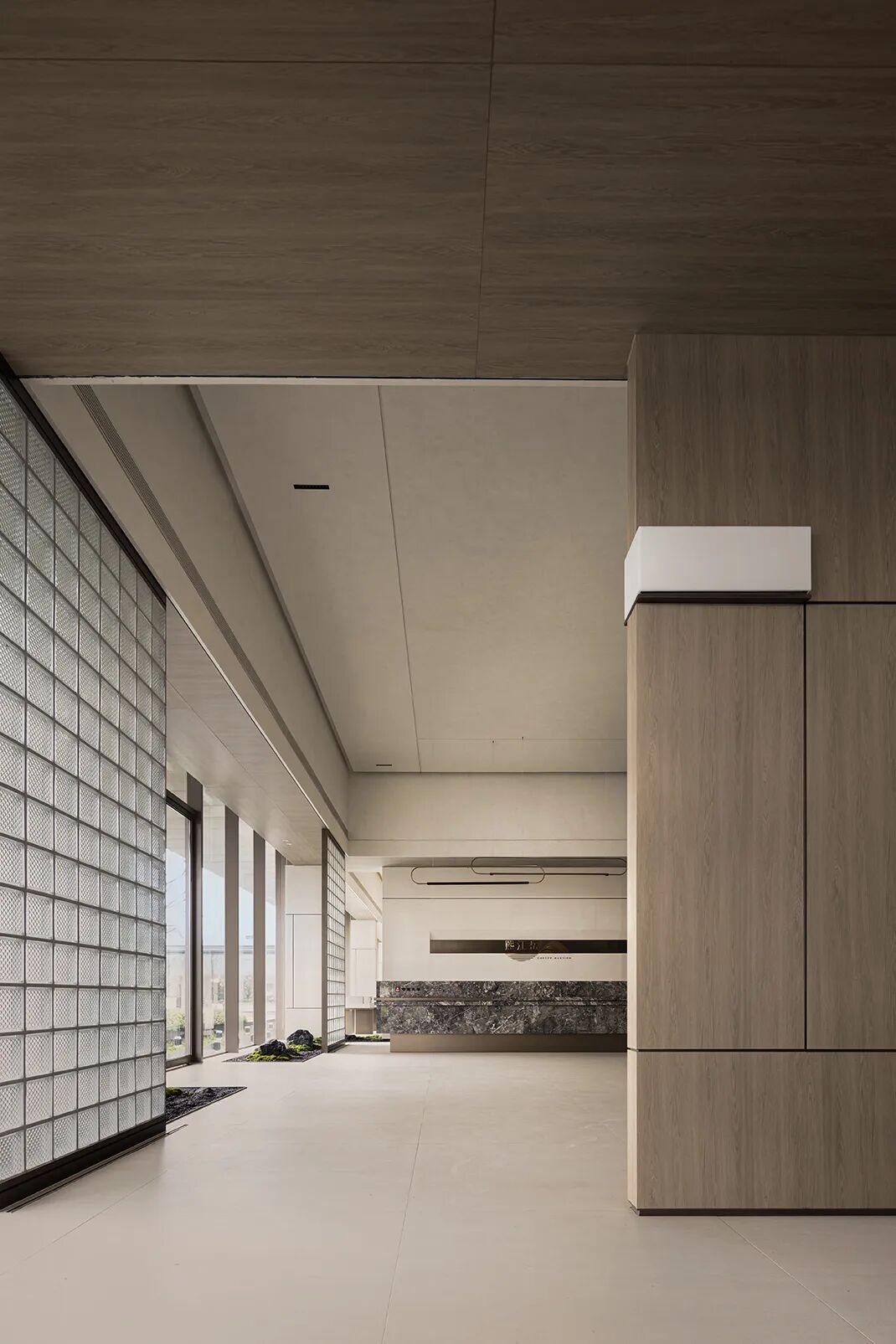 The project uses a large number of large panels of natural colors, dark bronze brushed stainless steel, art paint, wood veneer, glass bricks and beige stone, etc., which are laid out in the entire space with natural neutral tones.
