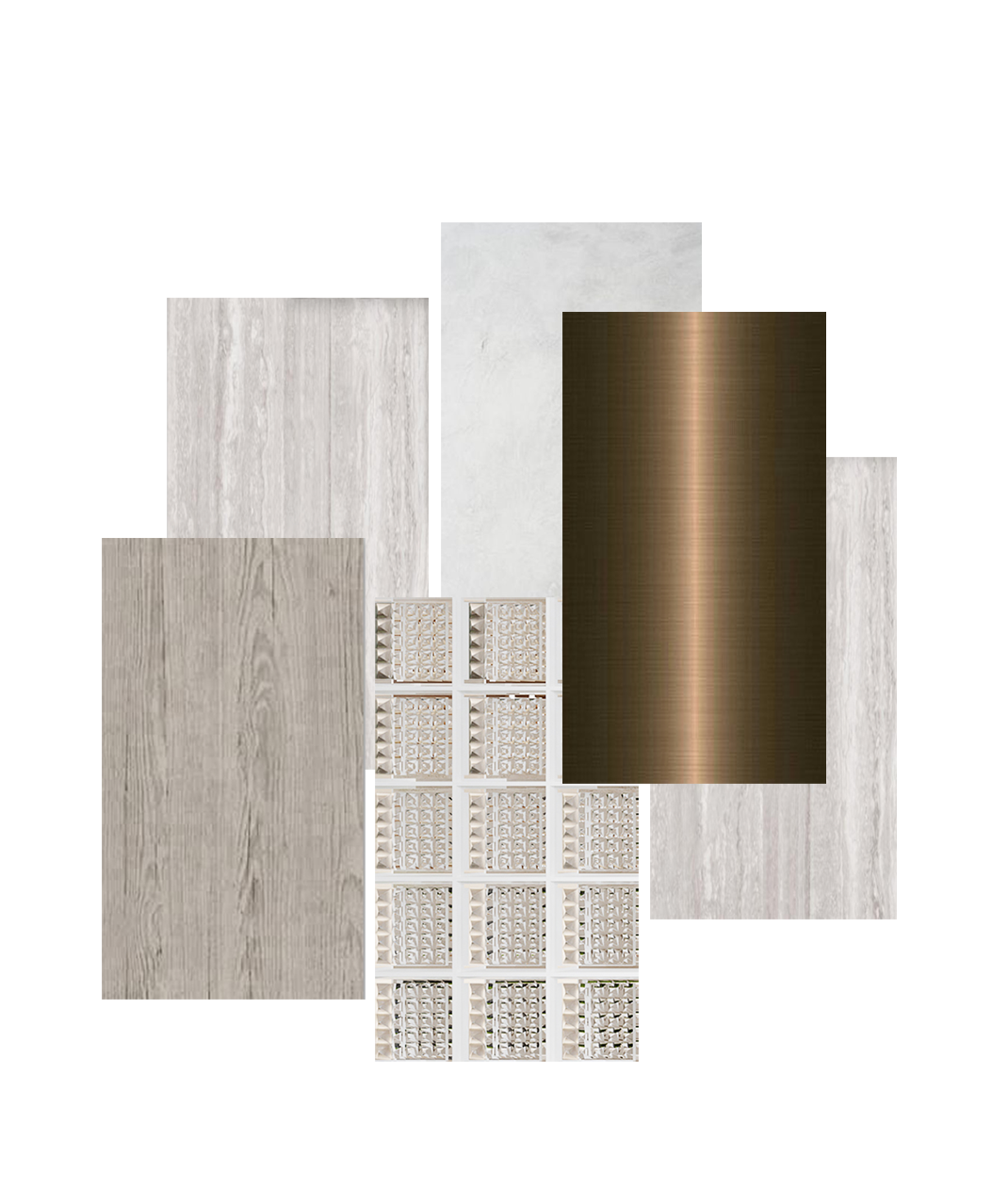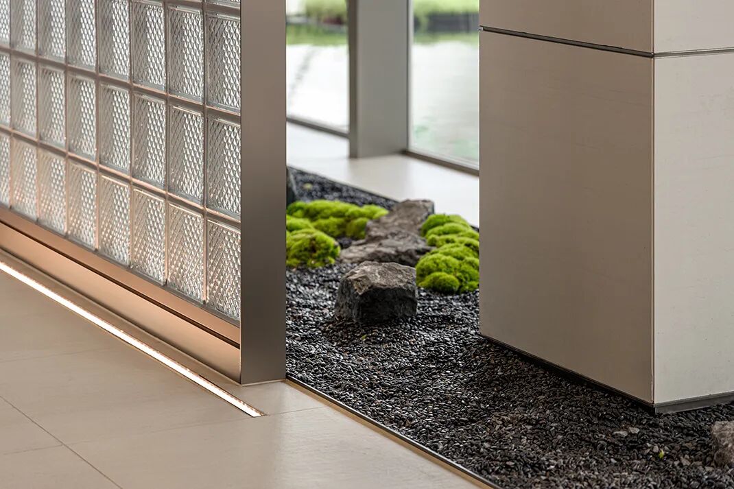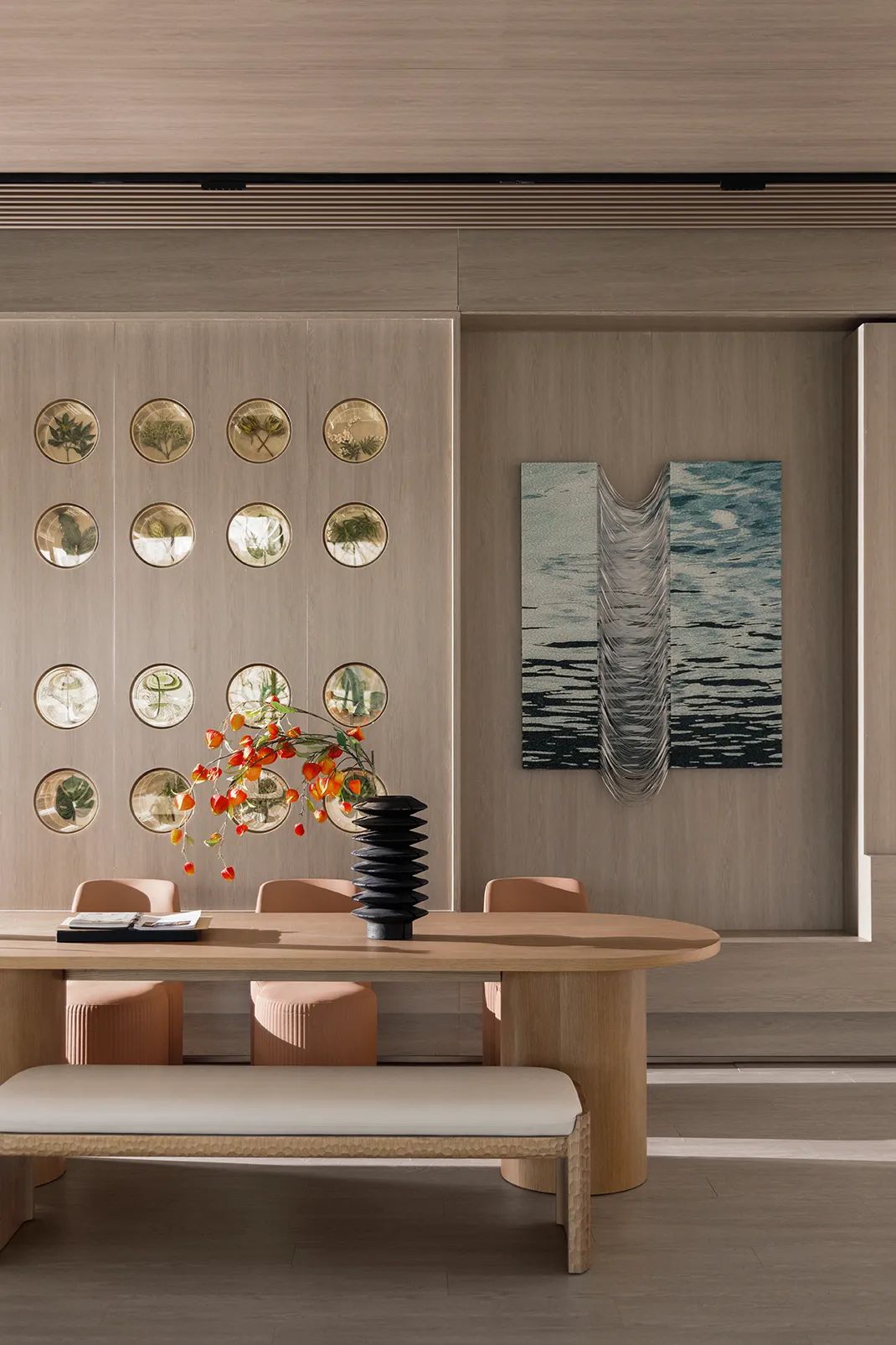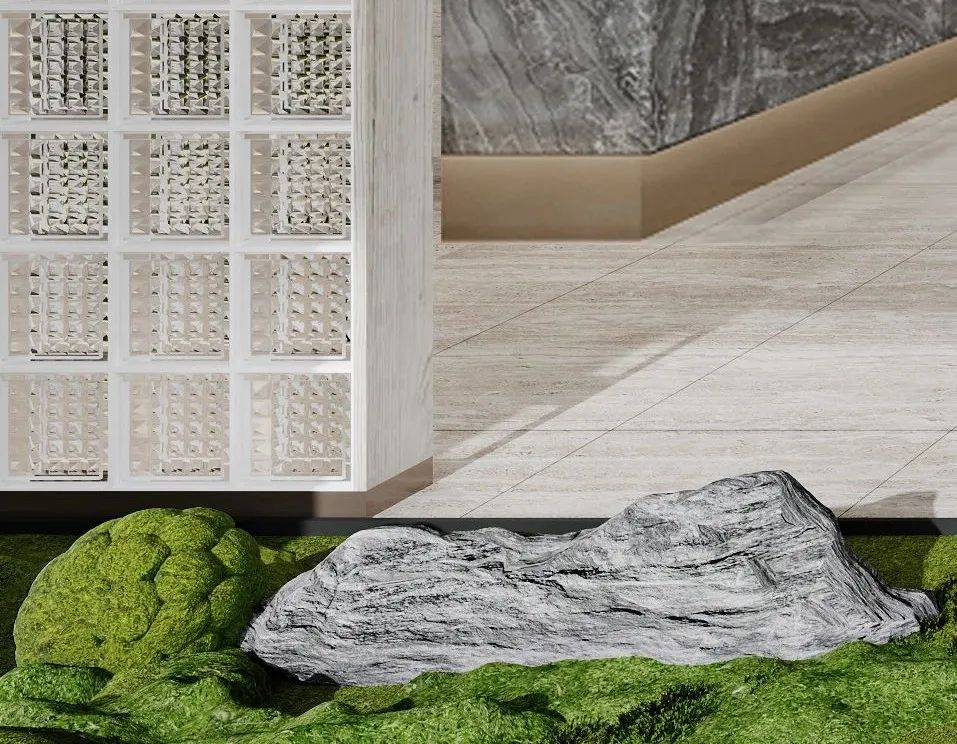 The project uses a large number of large panels of natural colors, dark bronze brushed stainless steel, art paint, wood veneer, glass bricks and beige stone, etc., which are laid out in the entire space with natural neutral tones.