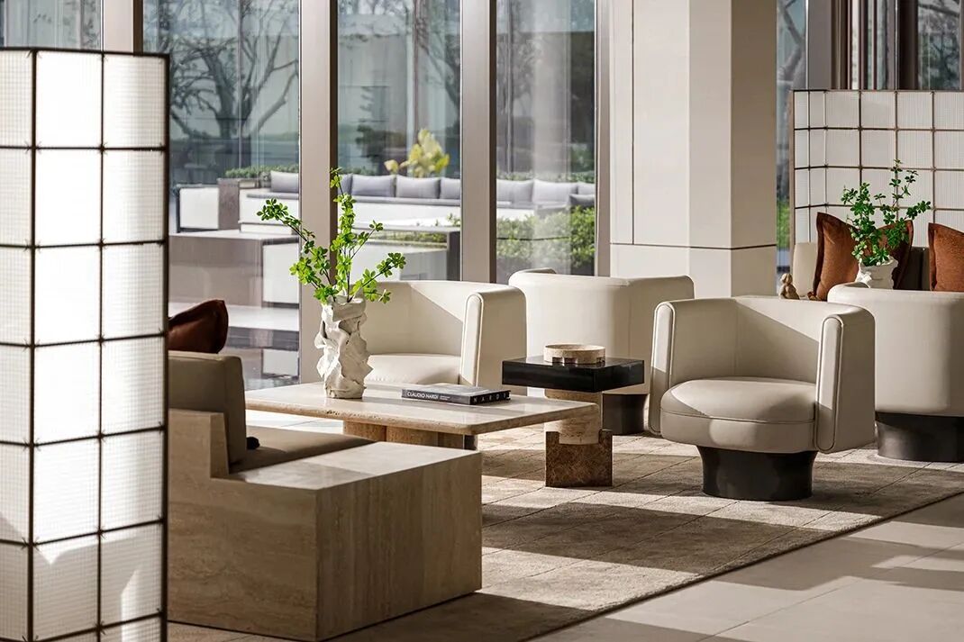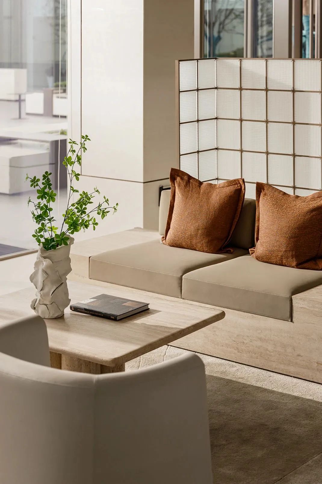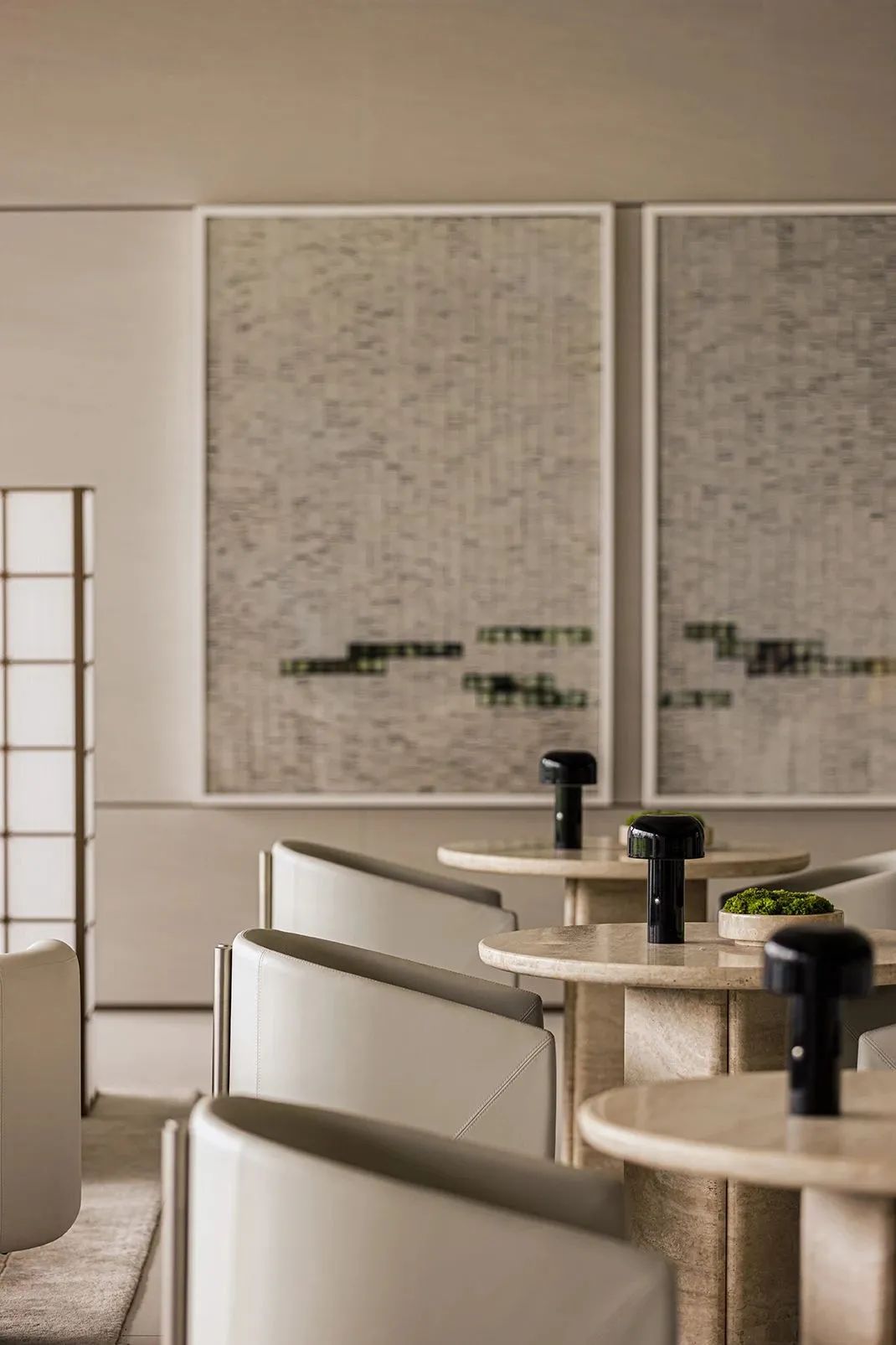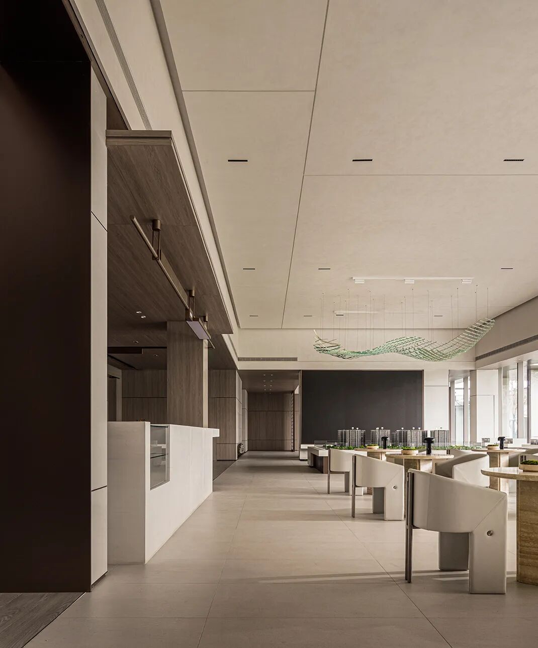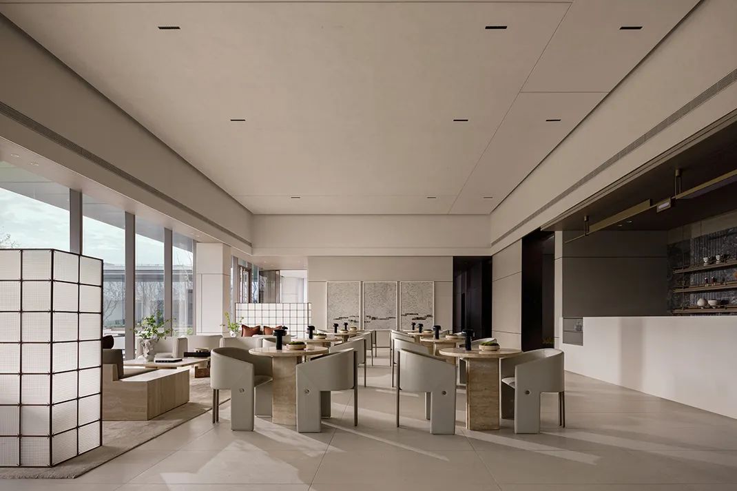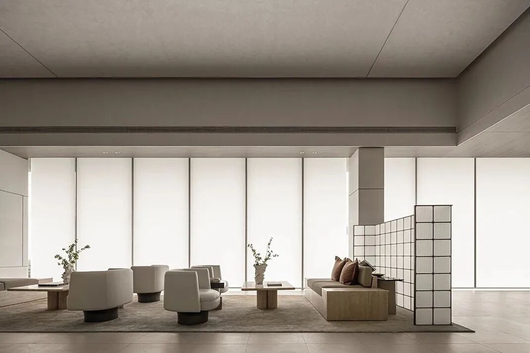 Stepping into the negotiating area, the whole space is suddenly high and open, with light gray leather seats standing in the middle, delicate and soft tones, natural materials with an oriental flavor, accompanied by bright light.
