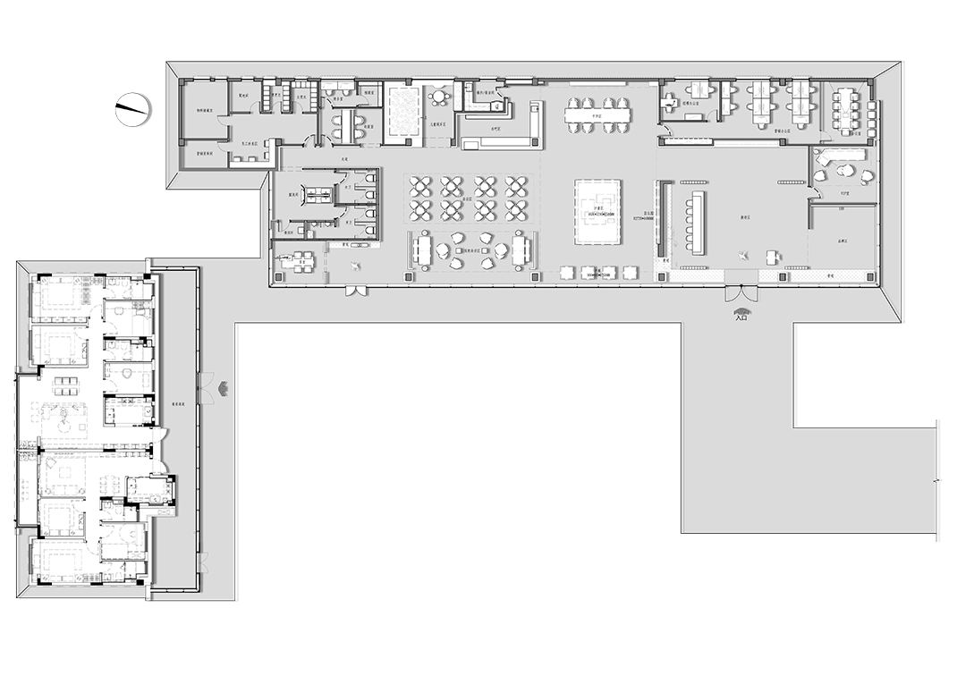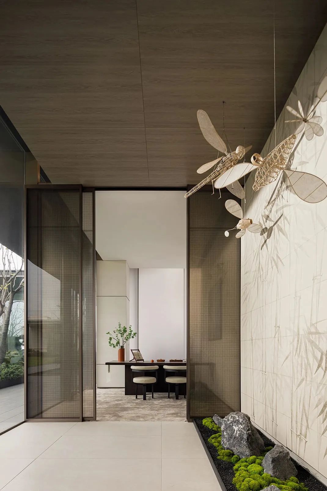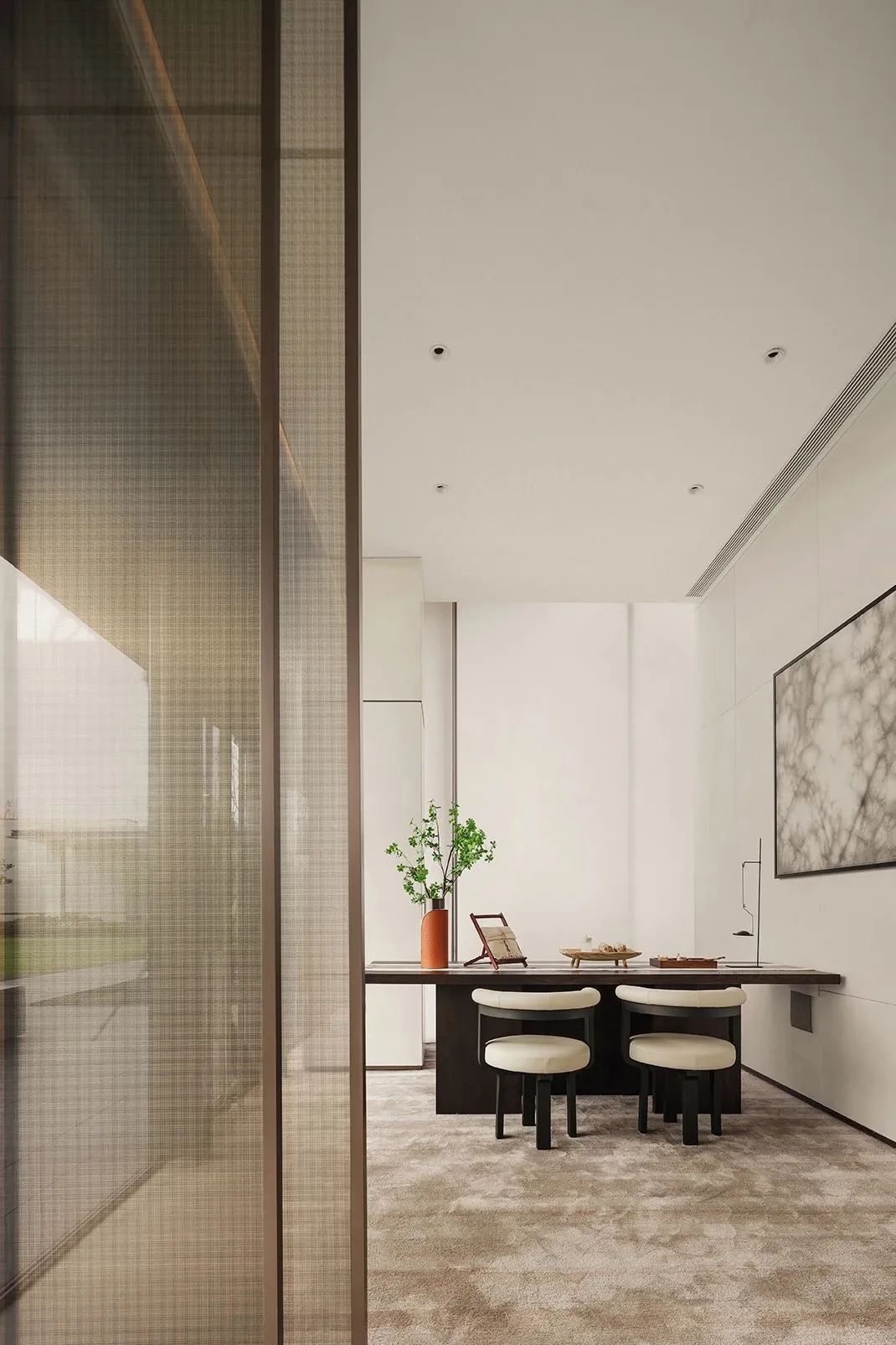 The space of the tea room continues the covenant of the four seasons and the glass screen at the door is pushed open, and the air of tea and smoke blows in. The space color of black, white and gray is just like the layout of Chinese painting, which is pleasant and elegant.
