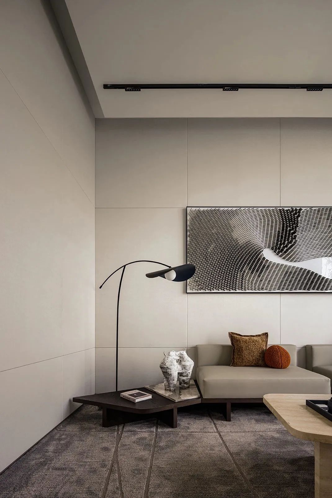 Different materials in the VIP interior complement each other, and the leather texture and the wall painting block are interestingly integrated. The simple space without a main lamp makes the floor lamp the protagonis an extension of nature.